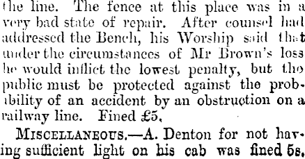 the line. The fence at this place was in a very bad state of repair. After counsel had addressed the Bench, Ids Worship said that under the circumstances of Mr Brown’s loss he would inflict the lowest penalty, but tho public must be protected against the probibility of an accident by an obstruction on a railway line. Fined £5, Miscellaneous.—A. Denton for not haring sufficient light on his cab was fined se.