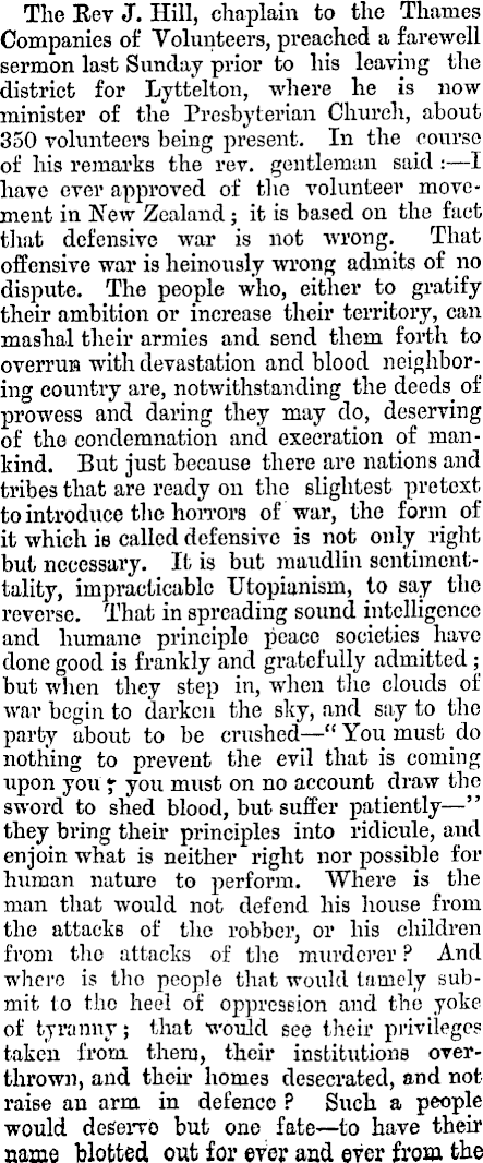The Rev J. Hill, chaplain to the Thames Companies of Volunteers, preached a farewell sermon last Sunday prior to his leaving the district for Lyttelton, where he is now minister of the Presbyterian Church, about 350 volunteers being present. In the course of his remarks the rev. gentleman said : —I have ever approved of the volunteer movement in New Zealand; it is based on the fact that defensive war is not wrong. That offensive war is heinously wrong admits of no dispute. The people who, either to gratify their ambition or increase their territory, can mashal their armies and send them forth to overrun with devastation and blood neighboring country are, notwithstanding the deeds of prowess and daring they may do, deserving of the condemnation and execration of mankind. But just because there are nations and tribes that are ready on the slightest pretext to introduce the horrors of war, the form of it which is called defensive is not only right but necessary. It is but maudlin sentimenttality, impracticable Utopianism, to say the reverse. That in spreading sound intelligence and humane principlo peace societies have done good is frankly and gratefully admitted; but when they step in, when the clouds of war begin to darken the sky, and say to the party about to be crushed —" You must do nothing to prevent the evil that is coming upon you •■ you must on no account draw the sword to shed blood, but suffer patiently —'' they bring their principles into ridicule, and enjoin what is neither right nor possible for human nature to perforin. Where is the man that would not defend his house from the attacks of the robber, or his children from the attacks of the murderer ? And where is tho people that would tamely submit to the heel of oppression and the yoke of tyranny; that would see their privilege? taken from them, their institutions overthrown, and their homes desecrated, and not raise an arm in defence ? Such a people would deserve but one fate—to have their name blotted out for ever and ever from the