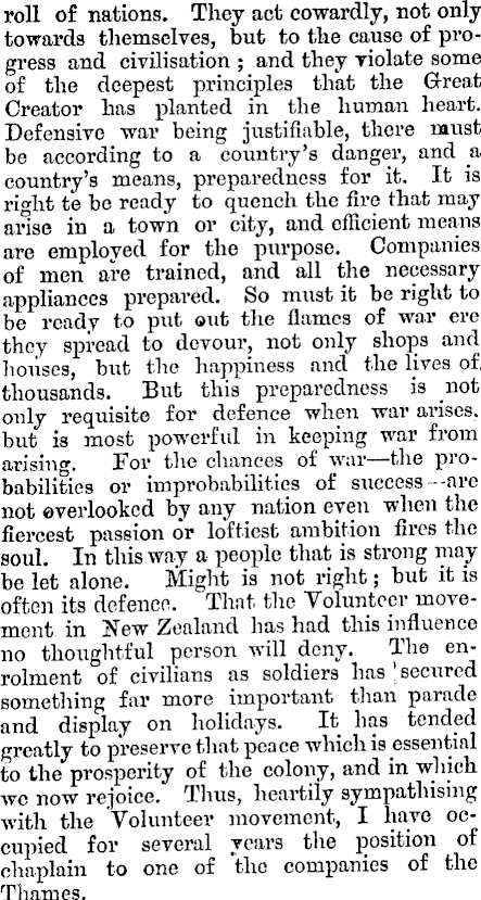 roll of nations. They act cowardly, not only towards themselves, but to the cause of progress and civilisation ; and they violate some of the deepest principles that the Great Creator has planted in the human heart. Defensive war being justifiable, there must be according to a country's danger, and a country's means, preparedness for it. It is right te bo ready to quench the fire that may arise in a town or city, and efficient means are employed for the purpose. Companies of men are trained, and all the necessary appliances prepared. So must it be right to be ready to put out the flames of war ere they spread to devour, not only shops and houses, but the happiness and the lives of. thousands. But this preparedness is not only requisite for defence when war arises, but is most powerful in keeping war from arising. For the chances of war —the probabilities or improbabilities of success--are not overlooked by any nation even when the fiercest passion or loftiest ambition fires the soul. In this way a people that is strong may be let alone. Might is not right; but it is often its defence. That, the Volunteer movement in New Zealand lias had this influence no thoughtful person will deny. The enrolment of civilians as soldiers has ' secured something far more important than parade and display on holidays. It lias tended greatly to preserve that peace which is essential to the prosperity of the colony, and in which we now rejoice. Tims, heartily sympathising witli the Volunteer movement, I have occupied for several years the position of chaplain to one of 'the companies of the Thames.