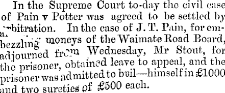 In the Supreme Court to-day the civil case of Pain y Potter was agreed to be settled by .'"bitration. In the case of J. T. Pain, for cm-i'-j moneys of theWaimateßoad Board, adjourned frtf* Wednesday, Mr Stout for the nrisoner, obtained leave to appeal, and the pi’isonei'was admitted to Wl-himselfin £IOOO and two sureties t>f £SOO each.