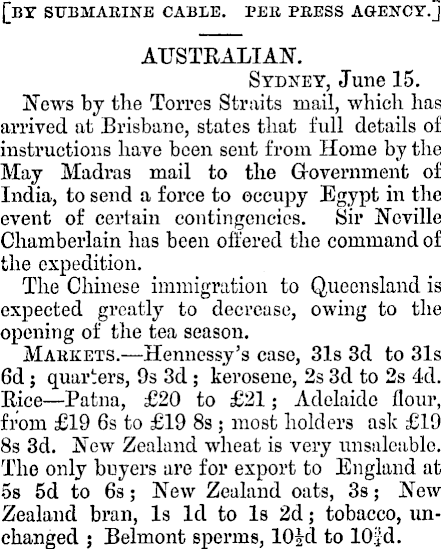 [by submarine cable, per press agency.] AUSTRALIAN. Sydney, June 15. News by the Torres Straits mail, which has arrived at Brisbane, states that full details of instructions have been sent from Home by the May Madras mail to the Government of India, to send a force to occupy Egypt in the event of certain contingencies. Sir Neville Chamberlain has been offered the command of the expedition. The Chinese immigration to Queensland is expected greatly to decrease, owing to the opening of the tea season. Markets. —Hennessy’s case, 31s 3d to 31s 6d; quarters, 9s 3d ; kerosene, 2s 3d to 2s 4d. Rice—Patna, £2O to £2l; Adelaide flour, from £l9 6s to £l9 8s ; most holders ask £l9 8s 3d. New Zealand wheat is very unsaleable. The only buyers are for export to England at 5s 5d to 6s; New Zealand oats, 3s; New Zealand bran, Is Id to Is 2d; tobacco, unchanged ; Belmont sperms, 10 Id to 10jd.