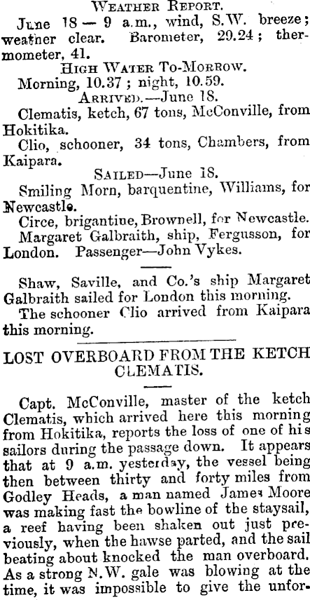 Weather Report. Jure 18—9 a.m., wind, S.W. breeze; weather clear. Barometer, 29.24; thermometer, 41. High Water To-Morrow. Morning, 10.37 ; night, 10.59. Arrived. — Juno IS. Clematis, ketch, 67 tons, McConville, from Hokitika. Clio, schooner, 34 tons, Chambers, from Kaipara. Sailed —June IS. Smiling Morn, barquentine, Williams, for Newcastle. Circe, brigantine, Brownell, for Newcastle. Margaret Galbraith, ship, Fergusson, for London. Passenger —J oh n Yykes. Shaw, Saville, and Co.’s ship Margaret Galbraith sailed for London this morning. The schooner Clio arrived from Kaipara this morning. LOST OVERBOARD FROM THE KETCH CLEMATIS. Capt. McConville, master of the ketch Clematis, which arrived here this morning from Hokitika, reports the loss of one of his sailors during the passage down. It appears that at 9 a.m. yesterday, the vessel being then between thirty and forty miles from Godley Heads, a man named James Moore was making fast the bowline of staysail, a reef having been shaken out just previously, when the hawse parted, and the sail beating about knocked the man overboard. As a strong N.W. gale was blowing at the time, it was impossible to give the unfor-