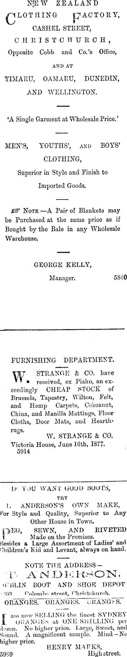 N|EW ZEALAND pLOTHING pACTORY, CASHEL STREET, CHRISTCHURCL, Opposite Cobb and Co.'s Office, TIMARU, OAMARU, DUNEDIN, AND WELLINGTON. 'A Single Garment at Wholesale Price.' MEN'S, YOUTHS', and BOYS' CLOTHING, Superior in Style and Einish to Imported Goods. 83" Note —A Pair of Blankets may be Purchased at the same price as if Bought by the Bale in any Wholesale Warehouse. GEORGE KELLY, Manager. FURNISHING DEPARTMENT. Yjn STRANGE & CO. have ' * • received, ex Piako, an exceedingly CHEAP STOCK of Brussels, Tapestry, Wilton, Felt, and Hemp Carpets, Co'coanut, China, and Manilla Mattings, Floor Cloths, Door Mats, and HearthJUc " W. STRANGE & CO. Victoria House, June 16th, 1877. 5914 ll< YOU WAN I GOOD BOOK, L. ANDERSON'S OWN MAKE, l (, or Style and Quality, Superior to Any Other House in Town. pEG, SEWN, AND RIVETED 1 Made on the Premises. Besides a Large Assortment of Ladies' and Children's Kid and Levant, always on hand. NOTE THE ADDRESS - T- ANDEBHON, • (.'BLIN BOOT A.ND SHOE DEPOT 'Oil nolombf ntr«flt, Ohrifitolmrnh. ORANGES. ORANGES. OBANGKS. iam now SELLING the finest SYDNEY OitANGEs at ONE SHILLING per dozen. No higher yrice. Large, Sweet, and Sound. A magnificent sample. Mind-No higher price. HENRY MAEKS, 59<;.9 High street.