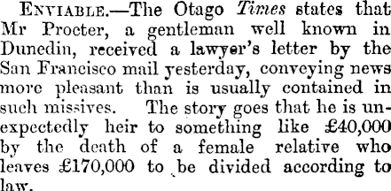 Enviable.—The Otago Times states that Mr Procter, a gentleman well known in Dunedin, received a lawyer's letter by the San Francisco mail yesterday, conveying news more pleasant than is usually contained in such missives. The story goes that he is unexpectedly heir to something like £40,000 by the death of a female relative who leaves £170,000 to be divided according to law.
