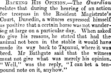 Backing His Opinion.—The Guardian relates that during the hearing of an action for trespass in the Resident Magistrate's Court, Dunedin, a witness expressed himself as positive that a certain horse was not wandering at large on a particular day. When asked to give his reasons, he stated that had the animal not been in the stable it would have made its way back to Tapanui, where it was bred. Mr Bathgate said that the witness must not give what was merely his opinion. "Well," was the reply, "I can bet a tenpound note on it, anyhow."