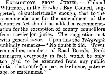 Exemptions from Juries. Colonel Whitmore, in the Hawke's Bay Council, suggested, characteristically enough, that to the recommendations for the amendment of the Counties Act should be added a recommendation for the exemption of county councillors from service |on juries. The suggestion met with general favor. Upon this the Telegraph unkindly remarks—" No doubt it did. Town councillors, members of Eoad Boards, Bank managers, everybody in fact, would be only too glad to be exempted from any public duties that conferjjno particular honor, patronage, or emolument."