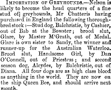 Importation or Greyhounds.—Nelson is likely to become the head quarters of a fine stud of] greyhounds, Mr Chatteris having purchased in England the following thoroughbred stock :—Stud dog, Balchristie, by Cashier, out of Bab at the Bowster; brood slut, Glare, by Master M'Grath, out of Medal. Glare is own sister to Sandy, the winner and runner-up for the Australian Waterloo. Brood slut, Handsome Girl, by Dan O'Connell, out of Priestess; and second season dog, Alcydes, by Balchristie, out of Diana. All four dogs are as high class blood as anything in the world. They are now on the ship Queen Bee, and should arrive ncxfc month.