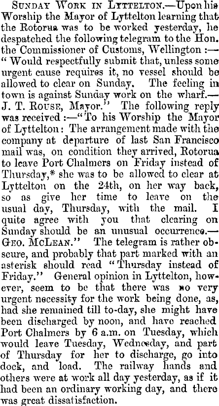 Sunday Work in Lyttelton.—Uponhia Worship the Mayor of Lyttelton learning that the Rotorua, was to be worked yesterday, he despatched the following telegram to the Hon. the Commissioner of Customs, Wellington : " Would respectfully submit that, unless some urgent cause requires it, no vessel should be allowed to clear on Sunday. The feeling in town is against Sunday work on the wharf.— J. T. Rouse, Mayor." The following reply was received : —" To his Worship the Mayor of Lyttelton: The arrangement made with the company at departure of last San Francisco mail was, on condition they arrived, Rotorua to leave Port Chalmers on Friday instead of Thursday,* she was to be allowed to clear afc Lyttelton on the 24th, on her way back, so' as give her time to leave on the usual day, Thursday, with the mail. I quite agree with you that clearing on Sunday should be an unusual occurrence.— Geo. McLean." The telegram is rather obscure, and probably that part marked with an asterisk should read " Thursday instead of Friday." General opinion in Lyttelton, however, seem to be that there was mo very urgent necessity for the work being done, as, had she remained till to-day, she might have been discharged by noon, and have reached Port Chalmers by 6 a.m. on Tuesday, which would leave Tuesday, Wednesday, and part of Thursday for her to discharge, go into dock, and load. The railway hands and others were at work all day yesterday, as if it had been an ordinary working day, and there was great dissatisfaction.