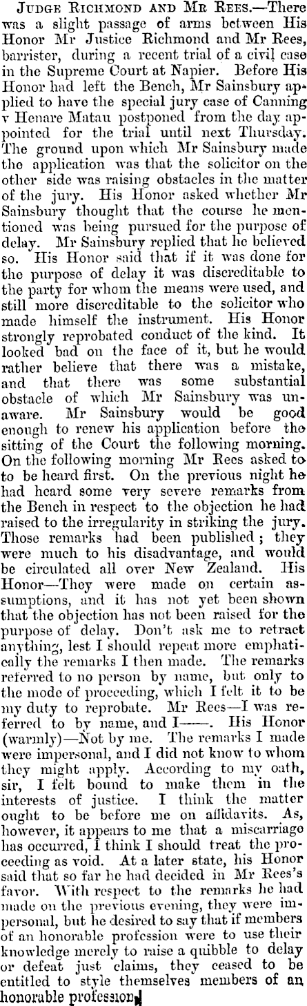 Judge Richmond and Mr Eees.—There was a slight passage of arras between His Honor Mr Justice Richmond and Mr Rees, barrister, during a recent trial of a civil case in the Supreme Court at Napier. Before His Honor had left the Bench, Mr Sainsbury ap* plied to have the special jury case of Canning v Hcnare Matau postponed from the day appointed for the trial until next Thursday. The ground upon which Mr Sainsbury made the application was that the solicitor on the other side was raising obstacles in the matter of the jury. His Honor asked whether Mr Sainsbury thought that the course he mentioned was being pursued for the purpose of delay. Mr Sainsbury replied that he believed so. His Honor said that if it was done for the purpose of delay it was discreditable to the party for whom the means were used, and still more discreditable to the solicitor who made himself the instrument. His Honor strongly reprobated conduct of the kind. It looked bad on the face of it, but he would rather believe that there was a mistake, and that there was some substantial obstacle of which Mr Sainsbury was unaware. Mr Sainsbury would be good enough to renew his application before the* sitting of the Court the following morning. On the following morning Mr Recs asked toto be heard first. On the previous night he had heard some very severe remarks from the Bench in respect to the objection he had raised to the irregularity in striking the jury. Those remarks had been published; they were much to his disadvantage, and would be circulated all over New Zealand. His Honor—They were made on certain assumptions, and it has not yet been shown that the objection has not been raised for the purpose of delay. Don't ask me to retract anything, lest I should repeat more emphatically the remarks I then made. The remarks referred to no person by name, but only to the mode of proceeding, which I felt it to be my duty to reprobate. Mr Rees—l was referred to by name, and I . His Honor (warmly) —Not by me. The remarks I made were impersonal, and I did not know to whom they might apply. According to my oath, sir,' I felt bound to make them in the interests of justice. I think the matter ought to be before me on aihdavits. As, however, it appears to me that a miscarriage has occurred, I think I should treat the proceeding as void. At a later state, his Honor said that so far he had decided in Mr Rees's favor. With respect to the remarks lie had made on the previous evening, they were impersonal, but lie desired to say that if members of an honorable profession were to use their knowledge merely to raise a quibble to delay or defeat just claims, they ceased to be entitled to style themselves' members of an honorable proi'es3iorj||