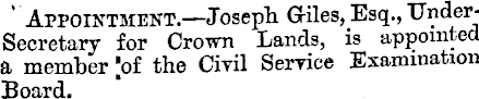 ' Appointment.—Joseph Giles, Esq., UnderSecretary for Crown Lands, is appointed a member Jof the Civil Service Examination Board.