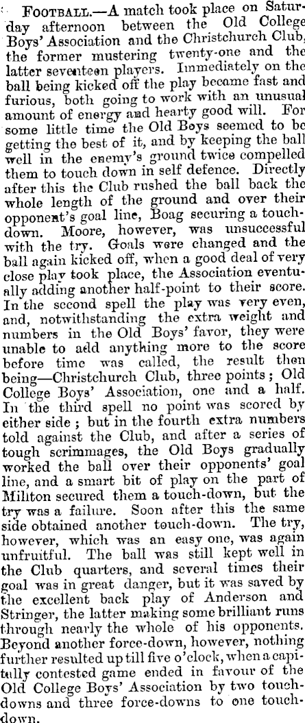 Football.—A match took place on Saturday afternoon between the Old Col ege Boys' Association and the Christchurch Club, the former mustering twenty-one and the latter seventeen players. Immediately on the ball being kicked off the play became fast and furious, both going to work with an unusual amount of energy and hearty good will. For some little time the Old Boys seemed to be getting- the best of it, and by keeping the ball well in the enemv's ground twice compelled them to touch down in self defence. Directly after this the Club rushed the ball back the whole length of the ground and over their opponent's goal line, Boag securing a touchdown. Moore, however, was unsuccessful with the try. Goals were changed and the ball again kicked off, when a good deal of very close plav took place, the Association eventually adding another half-point to their score. In the second spell the play was very even, and, notwithstanding the extra weight and numbers in the Old Boys' favor, they were unable to add anything more to the score before time was called, the result then being—Christchurch Club, three points ; Old College Boys' Association, one and a half. In the third spell no point was scored by either side ; but in the fourth extra numbers told against the Club, and after a series of tough scrimmages, the Old Boys gradually worked the ball over their opponents' goal line, and a smart bit of play on the part of Mihton secured them a touch-down, but the try was a failure. Soon after this the same side obtained another touch-down. The try, however, which was an easy one, was again unfruitful. The ball was still kept well in the Club quarters, and several times their goal was in great danger, but it vras saved by the excellent back play of Anderson and Stringer, the latter making some brilliant runs through nearly the whole of his opponents. Beyond another force-down, however, nothing further resulted up till five o'clock, when a capitally contested game ended in favour of the Old College Boys' Association by two touchdowns and three force-downs to one touchdown.