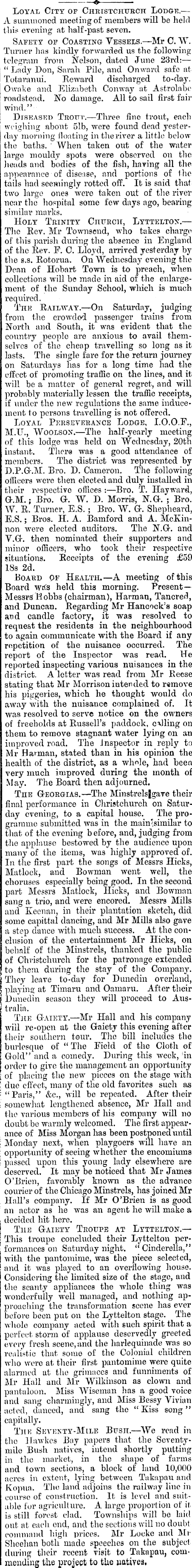 O Loyal City of Christchurch Lodge.— A summoned meeting of members will be held tills evening at half-past seven. Safety of Coasting Vessels. —Mr C. W. Turner has kindly forwarded us the following telegram from Nelson, dated June 23rd: — " Lady Don, Sarah Pile, and Onward safe at Totaranui. Reward discharged to-day. Owake and Elizabeth Conway at Astrolabe roadstead. No damage. All to sail first fair wind." Diseased Trout. —Three fine trout, each weighing about 51b, were found dead yesterday morning floating in the river a little below the baths. When taken out of the water large mouldy spots were observed on the J leads and bodies of the fish, having all the appearance of disease, and portions of the tails had seemingly rotted off. It is said that two large ones were taken out of the river near the hospital some few days ago, bearing similar marks. Holy Trinity Church, Lyttelton.— The Rev. Mr Townsend, who takes charge of this parish during the absence in England of the Rev. F. C. Lloyd, arrived yesterday by the s.s. Rotorua. On Wednesday evening the Dean of Hobart Town is to preach, when collections will be made in aid of the enlargement of the Sunday School, which is much required. The Railway.—On Saturday, judging from the crowded passenger trains from North and South, it was evident that the country people are anxious to avail themselves of the cheap travelling so long as it lasts. The single fare for the return journey on Saturdays has for a long time had the effect of promoting traffic on the lines, and it will be a matter of general regret, and will probably materially lessen the traffic receipts, if under the new regulations the same inducement to persons travelling is not offered. Loyal Perseverance Lodge, 1.0.0. P., MAT., Woolsox. —The half-yearly meeting of this lodge was held on Wednesday, 20th instant. There was a good attendance of members. The district was represented by D.P.G.M. Bro. D. Cameron. The following officers were then elected and duly installed in their respective offices : —Bro. T. Hayward, G-.M.; Bro. C. W. D. Morris, N.G-. ; Bro. W. R. Turner, E.S. ; Bro. W. G. Shepheard, E.S.; Bros. H. A. Bamford and A. McKinnon were elected auditors. The N.G-. and V.G-. then nominated their supporters and minor officers, who took their respective situations. Receipts of the evening £59 18s 2d. Boakd of Health.—A meeting of this Board wtfs held this morning. PresentMessrs Robbs (chairman), Harman, Tancred, and Duncan. Regarding Mr Hancock's soap and candle factory, it was resolved to request the residents in the neighbourhood to again communicate with the Board if any repetition of the nuisance occurred. The report of the Inspector was read. He reported inspecting various nuisances in the district. A letter was read from Mr Reese stating that Mr Morrison iutended to remove his piggeries, which he thought would do away with the nuisance complained of. It was resolved to serve notice on the owners of freeholds at Russell's paddock, calling on them to remove stagnant water lying on an improved road. The Inspector in reply to Mr Harman, stated than in his opinion the health of the district, as a whole, had been very much improved during the month of May. The Board then adjourned. The G-eorgias.—The Minstrels jgave their final performance in Christchurch on Saturday evening, to a capital house. The programme submitted was in the main'similar to that of the evening before, and, judging from the applause bestowed by the audience upon many of the items, was highly approved of. In the first part the songs of Messrs Hicks, Matlock, and Bowman went well, the choruses especially being good. In the second part Messrs Matlock, Hicks, and Bowman sang a trio, and were encored. Messrs Mills and Kecnan, in their plantation sketch, did some capittal dancing, and Mr Mills also gave a step dance with much success. At the conclusion of the entertainment Mr Hicks, on behalf of the Minstrels, thanked the public of Chi'istchurch for the patronage extended ! to them during the stay of the Company. j They leave to-day for Dunedin overland, > playing at Timaru and Oamaru. After their | Dunedin season they will proceed to Ausi tralia. | The Gaiety.—Mr Hall and his company J will re-open at the Gaiety this evening after I their southern tour. The bill includes the ] burlesque of " The Field of the Cloth of | Gold" and a comedy. During this week, in I order to give the management an opportunity t of placing the new pieces on the stage with ; due effect, many of the old favorites such as "Paris," &c, will be repeated. After their : somewhat lengthened absence, Mr Hall and the various members of his company will no doubt be warmly welcomed. The first appearance of Miss Morgan has been postponed until Monday next, when playgoers will have an ; opportunity of seeing whether the encomiums passed upon this young lady elsewhere are deserved. It may be noticed that Mr James O'Brien, favorably known as the advance courier of the Chicago Minstrels, has joined Mr Hall's company. If Mr O'Brien is as good an actor as he was an agent he will make a . decided hit here. j The Gaiety Troupe at Lyttelton.— ) This troupe concluded their Lyttelton per- ; formances on Saturday night. "Cinderella," i with the pantomime, was the piece selected, i and it was played to an overflowing house. 1 Considering the limited size of the stage, and the scanty appliances the whole thing was wonderfully well managed, and nothing approaching the transformation scene has ever before been put on the Lyttelton stage. The whole company acted with such spirit that a perfect storm of applause deservedly greeted every fresh scene, and the harlequinade was so realistic that some of the Colonial children who were at their first pantomime were quite alarmed at the grimaces and funniments of Mr Hall and Mr Wilkinson as clown and pantaloon. Miss AViseman has a good voice and sang charmingly, and Miss Bessy Vivian acted, danced, a