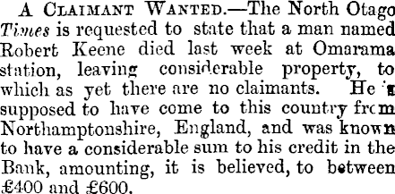 A Claimant Wanted. —The North Otago Thues is requested to state that a man named Eobert Keene died last week at Omarama station, leaving considerable property, to which as yet there are no claimants. He 'i supposed to hare come to this country frcm Northamptonshire, England, and was known to have a considerable sum to his credit in the Bank, amounting, it is believed, to between £4OO and £6OO.