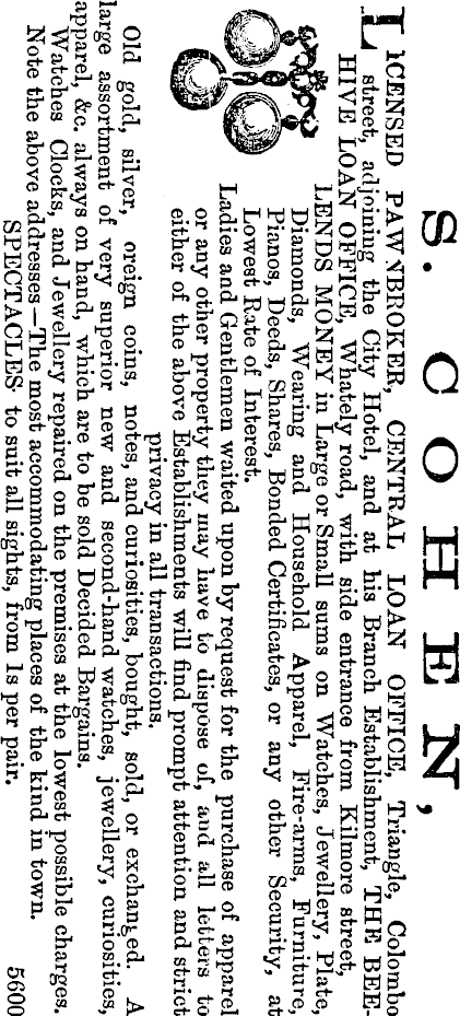 S. O O H E IST, ICENSED PAWNBROKER, CENTRAL LOAN OFFICE, Triangle, Colombo _J street, adjoining the City Hotel, and at his Branch Establishment, THE BEEHIVE LOAN OFFICE, Whately road, with side entrance from Kilmore street, LENDS MONEY in Large or Small sums on Watches, Jewellery, Plate, Diamonds, Wearing and Household Apparel, Fire-arms, Furniture, l 0 Pianos, Deeds, Shares, Bonded Certificates, or any other Security, at |a ILJS Lowest Rate of Interest. Ladies and Gentlemen waited upon by request for the purchase of apparel LvJaSI or any other property they may have to dispose of, and all letters to either of the above Establishments will find prompt attention and strict privacy in all transactions. Old gold, silver, oreign coins, notes, and curiosities, bought, sold, or exchanged. A large assortment of very superior new and second-hand watches, jewellery, curiosities, apparel, &c. always on hand, which are to be sold Decided Bargains. Watches Clocks, and Jewellery repaired on the premises at the lowest possible charges. Note the above addresses— The most accommodating places of the kind in town. SPECTACLES- to suit all sights, from Is per pair. 5600