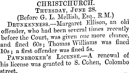 CHRISTCHURCH. Thursday, June 28. (Before Gf. L. Hellish, Esq., RM.) Drunkenness. —Margaret Ellison, an old offender, who had been several times recently before the Court, was given one more chance, and fined 60s; Thomas Williams was fined 10s ; a first offender was fined ss. Pawnbroker’s License.— A renewal of his license was granted to S. Cohen, Colombo street.