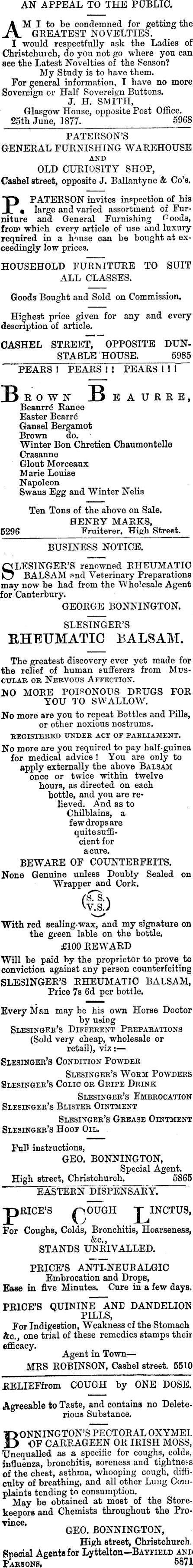 AN APPEAL TO THE PUBLIC. AM I to be condemned for getting the GREATEST NOVELTIES. I would respectfully ask the Ladies of Christchurch, do you not go where you can see the Latest Novelties of the Season? My Study is to have them. For general information, I have no more Sovereign or Half Sovereign Buttons. J. H. SMITH, Glasgow House, opposite Post Office. 25th June, 1877. 5968 PATERSON’S GENERAL FURNISHING WAREHOUSE AND OLD CURIOSITY SHOP, Cashel street, opposite J. Ballantyne & Go’s. P PATERSON invites inspection of his • large and varied assortment of Furniture and General Furnishing Goods, from which every article of use and luxury required in a house can be bought at exceedingly low prices. HOUSEHOLD FURNITURE TO SUIT ALL CLASSES. Goods Bought and Sold on Commission. Highest price given for any and every description of article. CASHEL STREET, OPPOSITE DUNSTABLE HOUSE. 5985 PEARS I PEARS S ! PEARS II ! BRO W N BEAU RR E, Beanrr6 Ranee Easter Bearr6 Gansel Bergamot Brown do. Winter Bon Chretien Chaumontelle Crasanne Glout Morceaux Marie Louise Napoleon Swans Egg and Winter Nelis Ten Tons of the above on Sale. HENRY MARKS, 5296 Fruiterer, High Street. BUSINESS NOTICE. SLESINGER’S renowned RHEUMATIC BALSAM and Veterinary Preparations may now be had from the Wholesale Agent for Canterbury. GEORGE BONNINGTON. SLESINGER’S BHEUMATIC BALSAM. The greatest discovery ever yet made for the relief of human sufferers from Muscular or Nervous Affection. NO MORE POISONOUS DRUGS FOR YOU TO SWALLOW. No more are you to repeat Bottles and Pills, or other noxious nostrums. REGISTERED UNDER ACT OF PAULI AMENT. No more are you required to pay half-guinea for medical advice ! You are only to apply externally the above Balsam once or twice within twelve hours, as directed on each bottle, and you are relieved. And as to Chilblains, a few drops are quite sufficient for a cure. BEWARE OF COUNTERFEITS. None Genuine unless Doubly Sealed on Wrapper and Cork. (€s.\ VvrJ With red sealing-wax, and my signature on the green lable on the bottle. £IOO REWARD Will be paid by the proprietor to prove to conviction against any person counterfeiting SLESINGER’S RHEUMATIC BALSAM, Price 7a 6d per bottle. Every Man may be his own Horse Doctor by using Slesingfr’s Different Preparations (Sold very cheap, wholesale or retail), viz:— Slesinger’s Condition Powder Slesinger’s Worm Powders Slesinger’s Colic or Gripe Drink Slesinger’s Embrocation Slesinger’s Blister Ointment Slesinger’s Grease Ointment Slesingeb’s Hoof Oil. Full instructions, GEO. BONNINGTON, Special Agent. High street, Christchurch. 5865 “ EASTERN DiSPENSARY’ P RICE’S QOUGH y^INOTUS, For Coughs, Colds, Bronchitis, Hoarseness, STANDS UNRIVALLED. PRICE’S ANTI-NEUBALGIC Embrocation and Drops, Ease in five Minutes. Cure in a few days, PRICE’S QUININE ANE DANDELION PILLS, For Indigestion, Weakness of the Stomach &c., one trial of these remedies stamps their efficacy. Agent in Town — MRS ROBINSON, Cashel street. 5510 RELIEFfrom COUGH by ONE DOSE. Agreeable to Taste, and contains no Deleterious Substance. BONNINGTON’S PECTORAL OXYMEL OF CARRAGEEN OR IRISH MOSS, Unequalled as a specific for coughs, colds, influenza, bronchitis, soreness and tightness of the chest, asthma, whooping cough, difficulty of breathing, and all other Lung Complaints tending to consumption. May be obtained at most of the Storekeepers and Chemists throughout the Province, GEO. BONNINGTON, High street, Christchurch. Special Agents for Lyttelton— Bayfield and Parsons, 5 §71