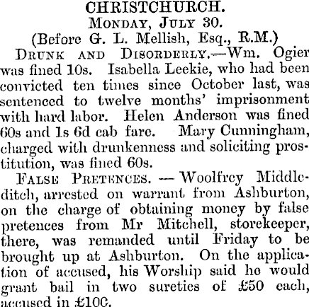 CHRISTCHURCH. Monday, July 30. (Before G. L. Hellish, Esq., R.M.) Drunk and Disorderly —Wm. Ogier was fined 10s. Isabella Decide, who had been convicted ten times since October last, was sentenced to twelve months’ imprisonment with hard labor. Helen Anderson was fined 60s and Is 6d cab fare. Mary Cunningham, charged with drunkenness and soliciting prostitution, was lined 60s. False Pretences. Woolfrcy Middleditch, arrested on warrant from Ashburton, on the charge of obtaining money by false pretences from Mr Mitchell, storekeeper, there, was remanded until Friday to be brought up at Ashburton. On the application of accused, his Worship said ho would grant bail in two sureties of £SO each, accused in £IOO.