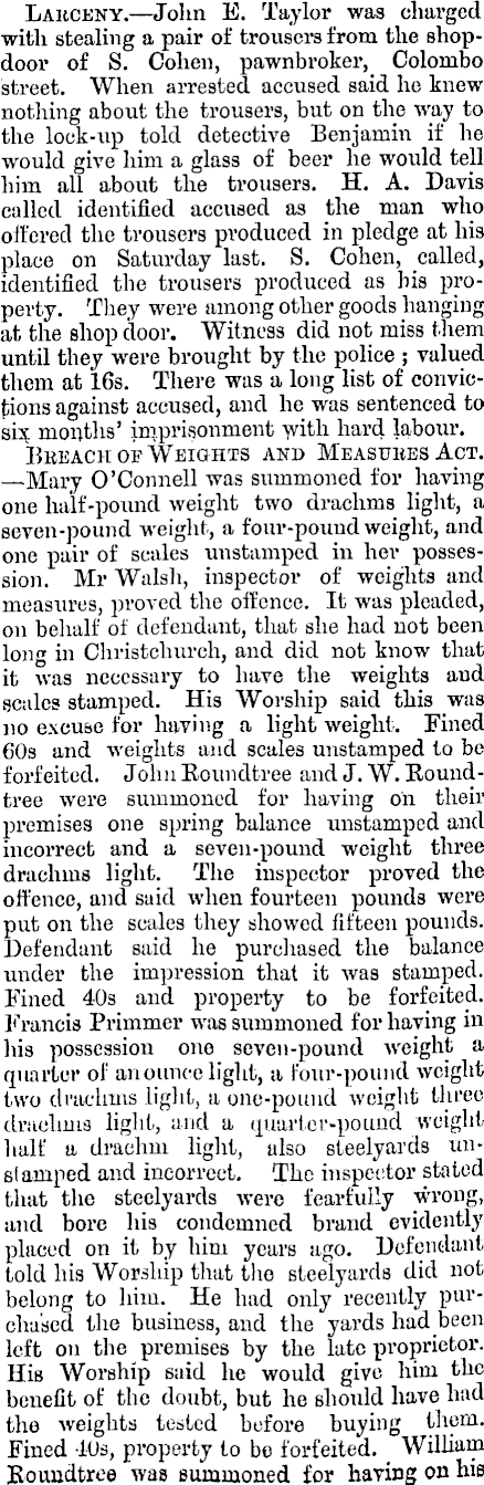Larceny.—John E. Taylor was charged with stealing a pair of trousers from the shopdoor of S. Cohen, pawnbroker, Colombo street. When arrested accused said ho knew nothing about the trousers, but on the way to the lock-up told detective Benjamin if he would give him a glass of beer he would tell him all about the trousers. H. A. Davis called identified accused as the man who offered the trousers produced in pledge at his place on Saturday last. S. Cohen, called, identified the trousers produced as his property. They were among other goods hanging at the shop door. Witness did not miss them until they were brought by the police ; valued them at 16s. There was a long list of convictions against accused, and he was sentenced to six months’ imprisonment with hard labour. Breach oe Weights and Measures Act. —Mary O’Connell was summoned for having one half-pound weight two drachms light, a seven-pound weight., a four-pound weight, and one pair of scales unstamped in her possession. Mr Walsh, inspector of weights and measures, proved the offence. It was pleaded, on behalf of defendant, that she had not been long in Christchurch, and did not know that it was necessary to have the weights and scales stamped. His Worship said this was no excuse for having a light weight. Fined 60s and weights and scales unstamped to be forfeited. John Roundtree and J. W. Roundtree were summoned for having on their premises one spring balance unstamped and incorrect and a seven-pound weight three drachms light. The inspector proved the offence, and said when fourteen pounds were put on the scales they showed fifteen pounds. Defendant said he purchased the balance under the impression that it was stamped. Fined 40s and property to be forfeited. Francis Primmer was summoned for having in his possession one seven-pound weight a quarter of an ounce light, a four-pound weight two drachms light, a one-pound weight three drachms light, and a quarter-pound weight half a drachm light, also steelyards unstamped and incorrect. The inspector stated that the steelyards were fearfully wrong, and bore his condemned brand evidently placed on it by him years ago. Defendant told his Worship that the steelyards did not belong to him. He had only recently purchased the business, and the yards had been left on the premises by the late proprietor. His Worship said he would give him the benefit of the doubt, but he should have had the weights tested before buying them. Fined 40s, property to be forfeited, _ William Roundtree was summoned for having on his