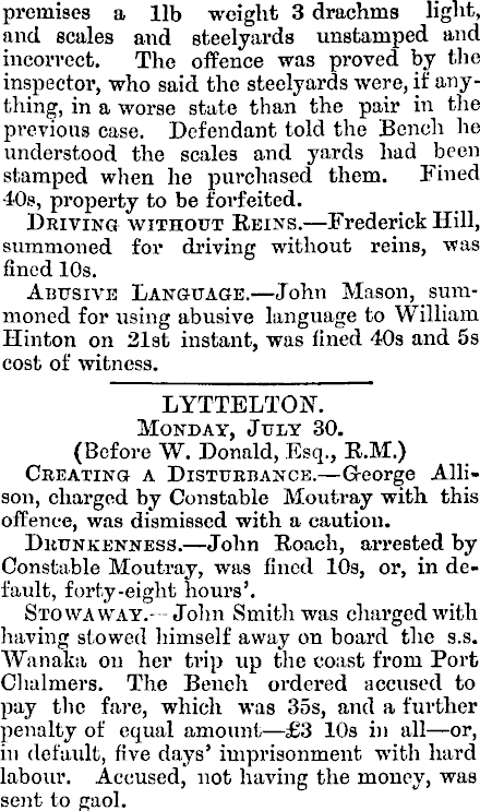 premises a 11b weight 3 drachms light, and scales and steelyards unstamped and incorrect. The offence was proved by the inspector, who said the steelyards were, if anything, in a worse state than the pair in the previous case. Defendant told the Bench he understood the scales and yards had been stamped when ho purchased them. Fined 40s, property to be forfeited. Driving without Reins. —Frederick Hill, summoned for driving without reins, was fined 10s. Abusive Language. —John Mason, summoned for using abusive language to William Hinton on 21st instant, was fined 40s and 5s cost of witness. LYTTELTON. Monday, July 30. (Before W. Donald, Esq., R.M.) Creating a Disturbance.— G-eorge Allison, charged by Constable Moutray with this offence, was dismissed with a caution. Drunkenness. —John Roach, arrested by Constable Moutray, was fined 10s, or, in default, forty-eight hours’. Stowaway.- John Smith was charged with having stowed himself away on board the s.s. Wanaka on her trip up the coast from Port Chalmers. The Bench ordered accused to pay the fare, which was 355, and a further penalty of equal amount —£3 10s in all—or, in default, five days’ imprisonment witli hard labour. Accused, not having the money, was sent to gaol.