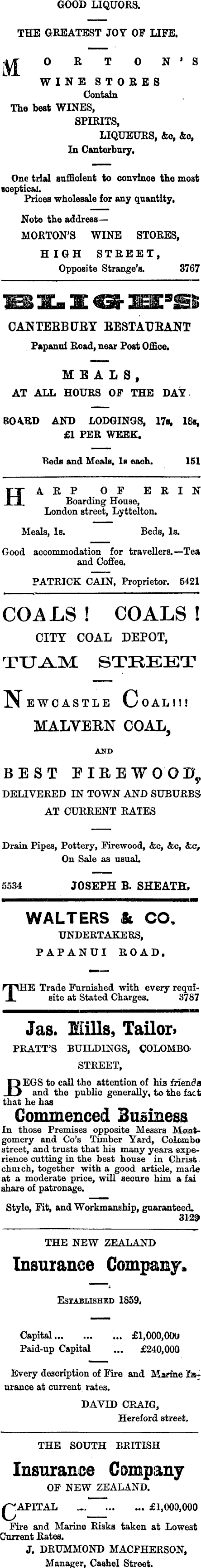 GOOD LIQUORS. THE GREATEST JOY OF LIFE. 0 R T ON’S L WINE STORES Contain The beat WINES, SPIRITS, LIQUEURS, &c, &o, In Canterbury. One trial sufficient to convince the most sceptical. Prices wholesale for any quantity. Note the address— MORTON’S WINE STORES, HIGH STREET, Opposite Strange’s. 3767 CANTEEBtJET BBSTAUBANT Fapanul Road, near Post Office. MEALS, AT ALL HOURS OF THE DAY BOARD AND LODGINGS, 17s, Ifc, £1 PER WEEK. Reds and Meals. Is each. 151 Harp of erin Boarding House, London street, Lyttelton. Meals, Is. Beds, Is. Good accommodation for travellers.—Tea and Coffee, PATRICK CAIN, Proprietor. 5421 COALS! COALS! CITY COAL DEPOT, TUAM STREET N EWCASTLE CoALll! MALVERN COAL, y AND BEST FIREWOOD', DELIVERED IN TOWN AND SUBURBS AT CURRENT RATES Drain Pipes, Pottery, Firewood, &c, &c, &c. On Sale as usual. 5534 JOSEPH B. SHEATH, WALTERS <fc CO, UNDERTAKERS, PAPANUI ROAD, THE Trade Furnished with every requisite at Stated Charges. 3787 Jas. Mills, Tailor> PRATT’S BUILDINGS, COLOMBOSTREET, BEGS to call the attention of his friends and the public generally, to the fact that he has Commenced Business In those Premises opposite Messrs Montgomery and Go’s Timber Yard, Colombo street, and trusts that his many years experience cutting in the best house in Christ chmch, together with a good article, made at a moderate price, will secure him a fai share of patronage. Style, Fit, and Workmanship, guaranteed, 3129 THE NEW ZEALAND Insurance Company. Established 1859. Capital ... £1,000,000 Paid-up Capital ... £240,000 Every description of Fire and Marine I’eurance at current rates. DAVID CRAIG, Hereford street. THE SOUTH BRITISH Insurance Company OF NEW ZEALAND. QAPITAL ... ... ... £1,000,000 Fire and Marine Risks taken at Lowest Current Rates. J. DRUMMOND MACPHERSON, Manager, Cashel Street.