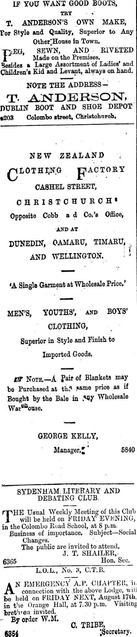 IF YOU WANT GOOD BOOTS, TRY T. ANDERSON’S OWN MAKE, For Style and Quality, Superior to Any Other‘House in Town. F;EG, SEWN, AND RIVETED Made on the Premises. Besides a Large Assortment of Ladies’ and Children’s Kid and Levant, always on hand. NOTE THE ADDRESST- ANDERBOIST, DUBLIN BOOT AND SHOE DEPOT *203 Colombo street, Christchurch. NEW ZEALAND piACTORY CASHEL STREET, CHRISTCHURCH 11 Opposite Cobb a d Co.’s Office, AND AT DUNEDIN, OAMARU, TIMARU, AND WELLINGTON. *A Single Garment at Wholesale Price,’ MEN’S, YOUTHS’, and BOYS’ CLOTHING, Superior in Style and Finish to Imported Goods. IST Note.—A fair of Blankets may be Purchased at th.? pame price as if Bought by the Bale in Wholesale War^ouae, GEORGE KELLY, Manager, £ 5840 SYDENHAM. LITERARY AND DEBATING CLUB. THE Usual Weekly Meeting of this Club will be held on FRIDAY EVENING, in the Colombo Road School, at 8 p.m. Business of importance. Subject—Social Changes. The public are invited to attend. J. T. SHAILER, 6365 Hon. Sec. “ L.0.L., No. 3, C.T.B. An emergency' a.p. chapter, a connection with the above Lodge, wili be held on FRIDAY NEXT, August 17th in the Orange Hall, at 7.30 p.m. Visiting brethren invited. By order W.M, y 0. TRIBE, ggg| ‘.Secretary.