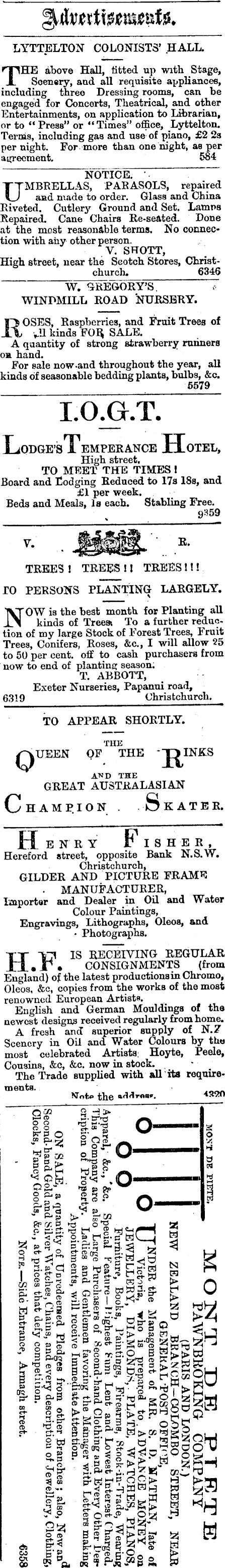 gmlwtttemimfs. LYTTELTON COLONISTS’ HALL. THE above Hall, fitted up with Stage, Scenery, and all requisite appliances, including three Dressing rooms, can be engaged for Concerts, Theatrical, and other Entertainments, on application to Librarian, or to “ Press” or “ Times” office, Lyttelton. Terms, including gas and use of piano, £2 2s per night. For more than one night, as per agreement. &84 NOTICE. UMBRELLAS, PARASOLS, repaired and made to order. Glass and China Riveted. Cutlery Ground and Set. Lamps Repaired. Cane Chairs Re-seated. Done at the most reasonable terms. No connection with any other person. V. SHOTT, High street, near the Scotch Stores, Christchurch. 6346 WINDMILL ROAD NURSERY. OSES, Raspberries, and Fruit Trees of 3 kinds FOF* SALE. A quantity of strong strawberry runners on hand. For sale now and throughout the year, all kinds of seasonable bedding plants, bulbs, &c. 5579 1.0.Gr.T. TH Lodge’s 1 emperance XXotel, High street. TO MEET THE TIMES ! Board and Lodging Reduced to 17a 18s, and £1 per week. Beds and Meals, la each. Stabling Free. 9^59 V. R. TREES! TREES! I TREES 1!! TO PERSONS PLANTING LARGELY. NOW is the best month for Planting all kinds of Trees-. To a further reduction of my large Stock of Forest Trees, Fruit Trees, Conifers, Roses, &c., I will allow 25 to 50 per cent, off to cash purchasers from now to end of planting season. T. ABBOTT, Exeter Nurseries, Papanui road, 6319 Christchurch. TO APPEAR SHORTLY. kUEEN Q Champion THK OF THE 1 INKS and the GREAT AUSTRALASIAN E, l] Skater. Fi ENRY r ISHER, Hereford street, opposite Bank N.S.W. Christchurch, GILDER AND PICTURE FRAME . MANUFACTURER, Importer and Dealer in Oil and Water Colour Paintings, Engravings, Lithographs, Oleoa, and • Photographs. H-n IS RECEIVING REGULAR ,jP • CONSIGNMENTS (from England) of the latest productions in Chromo, Oleos, &c, copies from the works of the most renowned European Artists. English and German Mouldings of the newest designs received regularly from home. A fresh and superior supply of N.Z Scenery in Oil and Water Colours by the most celebrated Artists Hoyte, Peele, Cousins, &c, &c. now in stock. The Trade supplied with all its requirementa. Mnfcfl the -ISvO I— < o o 2 a O BT P O HH tT* s 3 » & o h *< og O ’ o O ° I gp 5^.0S pf >TS -id p o* “ P- 55 w ap y. o m o*o 1 - 2. » bg-e HV 1 5 £1 g £. a. <3 >a 3“» V «<jb 3.g.d § £ hip 5 MO 1 ? 3 2 cT d c “8-a _ 5-* 3 hs td 3. c+* IfsTfo’ST H- b CD —* £T «a 3 - m 4 £ 20 era * b tr- &T, 250 p ! c<- S op-- n> or P. S 3 : 2 c- A g- P 3 gg!T § g Cu 3 P'OQ *0 (i 2 CD_ -3 C P ■Jj CO CD h? o t ET. O 3 g < 2 p p tz& 2 3 § b® 5- - y ‘S P P 3>.,2p /so » s*< d p ST 1 to -g » xq 2 _ a p a®,—. 2 = |- s sr-S-S-sS-s 11 fcagsis" so %$ lg|s--a> K ~ W &£ 3' bap b ■ ; Sb S.P b g--2 to £L-‘ 9 p g- S 3 ■3 p S’<R oq o £ b_ ►= P£sS3=s g < Xyl ?KHP CS d-p O 1 M • ,b a--3 2 P CD ~3 P a* c* w