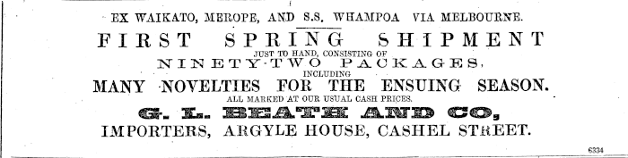 EX WAIKATO, MBROPB, AND S.S. WHAMPOA VIA MELBOURNE. FIRST SPR I~N~G SHIPMENT JUST TO HAND, CONSISTING OP NINETY -TWO PYOKA.GES, INCLUDING MANY NOVELTIES FOR THE ENSUING SEASON. ALL MARKED AT OUR USUAL CASH PRICES. 43-. X.. BSATM AMS GO, IMPORTERS, AH GYLE HOUSE, CASHEL STREET.