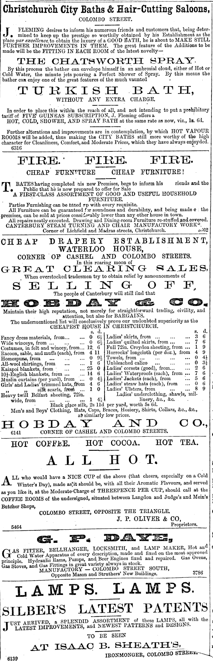 Christchurch City Baths & Hair-Cutting Saloons, COLOMBO STREET. J FLEMING desires to inform his numerous friends and customers that, being detere mined to keep up the prestige so worthily obtained by his Establishment as the place j)ar excellence, to obtain the luxury of a GOOD BATH, he is about to MAKE STILL FURTHER IMPROVEMENTS IN THEM. The great feature of the Additions to be made will be the FITTING IN EACH ROOM of the latest novelty— THE CHATHWOBTH SPRAYBy this process the bather can envelope himself in an ambrosial cloud, either of Hot or Cold Water, the minute jets pouring a Perfect Shower of Spray. By this means the bather can enjoy one of the great features of the much vaunted TTJKKIBH BA.TH, WITHOUT ANY EXTRA CHARGE. In order to place this within the reach of all, and not intending to put a prohibitory tariff of FIVE* GUINEAS SUBSCRIPTION, J. Fleming offers a HOT, COLD, SHOWER, AND SPRAY BATH at the same rate as now, viz., Is. 6d. Further alterations and improvements are in contemplation, by which HOT VAPOUR ROOMS will be added, thus making the CITY BATHS still more worthy of the high character for Cleanliness, Comfort, and Moderate Prices, which they have always enjoyded. 6316 FIRE. FIRE. FIRE. CHEAP FHENTTUEE CHEAP EUENITUEE! riends and the T BATE 8 having completed nis new Premises, begs to inform his • Public that he is now prepared to offer for Sale A FIRST-CLASS ASSORTMENT OP GOOD AND USEFUL HOUSEHOLD FURNITURE, Parties Furnishing can be htted with every requisite. All Furniture can be guaranteed fir soundness and durability, and being made o the premises, can be sold at prices considerably lower than any other house in town. All repairs neatly executed. Drawing and Dining-room Furniture re-stuffed and covered. CANTERBURY STEAM TURNING AND CHAIR MANUFACTORY WORK®, Corner of Lichfield and Madras streets, Christchurch. <>'’62 CHEAP DRAPERY ESTABLISHMENT, ■Waterloo house, COENEB OP CASHEL AND COLOMBO STEEETS. In this roaring moon of gbrat clearing sales, When overstocked tradesmen try to obtain relief by announcements of SELLING O F E. The people of Canterbury will still find that Maintain their high reputation, not merely for straightforward trading, civility, and attention, but also for BARGAINS. The undermentioned list will conclusively prove our undoubted superiority as the CHEAPEST HOUSE IN CHRISTCHURCH, s. d. Fancy dress materials, from 0 64 Wide winceys, from ... ... ... 064 Costumes, in felt and wincey, from... 12. 6 Racoon, sable, and muffs (each), from 4 11 Homespuns, from All-wool shirtings, from Kaiapoi blankets, from 10|-English blankets, from Muslin curtains (per yard), from ... Girls’ and Ladies’ trimmed hats, .from „ „ silk scarfs, froth ... Heavy twill Belfast sheeting, 72in. wide, from 0 1 25 14 0 4 1 1 44 Ladies’ skirts, from Ladies’ quilted skirts, from Full 72in. Croydon sheeting, from ... Horrocks’ longcloth (per doz.), from Towels, from Unbleached calico Ladies’ corsets (good), from f Ladies’ Waterproofs (each), from ... 1 Ladies’Jackets (each), from ... I Ladies’ straw hats (each), from ... t Ladies’ Ulsters, from f Ladies’ underclothing, shawls, mil linery, &c., &c. Black gl?ce silk, 2s lid per yard, worth 5s 6d, Men’s and Boys’ Clothing, Hats, Caps, Braces, Hosiery, Shirts, Collars, &c., &c. air similarly low prices. IT O 13 13 A. Y AND 6141 CORNER OP CASHEL AND COLOMBO STREETS. o 0., HOT COFFEE. HOT COCOA. HOT TEA. ALL HOT. A LL who would have a NICE CUP of the above (that cheers, especially on a Cold \- Winter’s Day), made as’it should be, with all their Aromatic Flavours, and served j y OU like it, at the Moderate-Charge of THREEPENCE PER CUP, should call at the OFFEE ROOMS of the undersigned, situated between Langdon and Judge’s and Mein’s utoher Shops, COLOMBO STREET, OPPOSITE THE TRIANGLE. J. P. OLIYEE & CO, 5464 Proprietors. AQ ETTTER BELLHANGER, LOCKSMITH, and LAMP MAKER, Hot rnlß Water Apparatus of every description, made and fixed on the most approved ip£ Hydrant l Ems, Pumps, and Beer Engines fixed and repaired. Gas Ovens, stnvpn and Gas Fittings in great variety always in stock. jtoves, »d UE / CTo |y _ COLOMBO STREET SOUTH, Opposite Mason and Strnthers’ New Buildings. lamps, lamps. [LBEB’S LATEST PATENTS ARRIVED, a SPLENDID ASSORTMENT of these LAMPS, all with the LATEST IMPROVEMENTS, and NEWEST PATTERNS and DESIGNS. TO BE SEEN Air ISAAC 33. SHEATH'S, IRONMONGER, COLOMBO STREex.