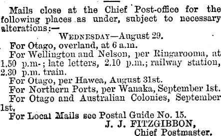 Mails close at the Chief Post-office for the following places as under, subject to necessary alterations Wednesday— August 29. For Otago, overland, at 6 a.m. For Wellington and Nelson, per Kiugarooma, at 1.50 p.m-; late letters, 2.10 p.m.; railway station, 2.30 p.m. train. For Otago, per Hawea, August 31st. For Northern Ports, per Wauaka, September Ist. For Otago and Australian Colonies, September Ist, For Local Mails sec Postal Guide No. 15. J. J. FITZGIBBON, Chief Postmaster.