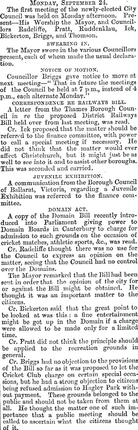 Monday, September 24. The first meeting of the newly-elected City Council was held on Monday afternoon. Present—His Worship the Mayor, and Councillors Radclift'e, Pratt, Ruddcnklau, Ick, Bickei'ton, Briggs, and Thomson. SWEAEING- in. The Mayor swore in the various Councillors present, each of whom made the usual declaration. NOTICE or MOTION. Councillor Briggs gave notice to move at next meeting—" That in future the meetings of the Council be held at 7 p.m., instead of 4 p.m., each alternate Monday." CORRESPONDENCE BE EAILWAYS BILIi. A letter from the Thames Borough Coun- < cil in re the proposed District Railways Bill held over from last meeting, was read. Cr. Ick proposed that the matter should be referred to the finance committee, with power to call a special meeting if necessary. He did not think that the matter would ever affect Christchurch, but it might just be as well to see into it and to assist other boroughs. This was seconded and carried. JUVENILE EXHIBITION. A communication from the Borough Council of Ballarat, Victoria, regarding a Juvenile Exhibition was referred to the finance committee. DOMAIN ACT. A copy of the Domain Bill recently introduced into Parliament giving power to Domain Boards in Canterbury to charge for admission to such grounds on the occasion of cricket matches, athletic sports, &c, was read. Cr. Radcliffe thought there was no use for the Council to express an opinion on the matter, seeing that the Council had no control over the Domains. The Mayor remarked that the Bill had been sent in order that the opinion of the city for or against the Bill might be obtained. He thought it was an important matter to the citizens. Cr. Bickerton said that the great point to be looked at was this : a fine entertainment might be got up in the Domain if a charge were allowed to be made only for a limited time. Cr. Pratt did not think the principle should be applied to the recreation grounds in general. Cr. Briggs had no objection to the provisions of the Bill so far as it was proposed to let the Cricket Club charge on certain special occasions, but he had a strong objection to citizens being refused admission to Hagloy Park without payment. These grounds belonged to the public and should not be taken from them at all. He thought the matter one of such importance that a public meeting should be called to ascertain what the citizens thought of it.