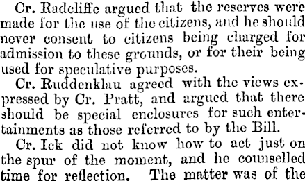 Cr. Kadcliffe argued that the reserves were made for the use of the citizens, and lie should never consent to citizens being charged for admission to these grounds, or for their being used for speculative purposes. Cr. Ruddenklau agreed with the views expressed by Cr. Pratt, and argued that there should be special enclosures for such entertainments as those referred to by the Bill. Cr. Ick did not know how to act just on the spur of the moment, and he counselled time for reflection. The matter was of the