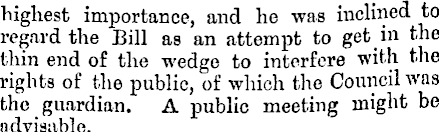 highest importance, and he was inclined to regard the Bill as an attempt to get in the thin end of the wedge to interfere with the rights of the public, of which the Council was the guardian. A public meeting might be advisable.