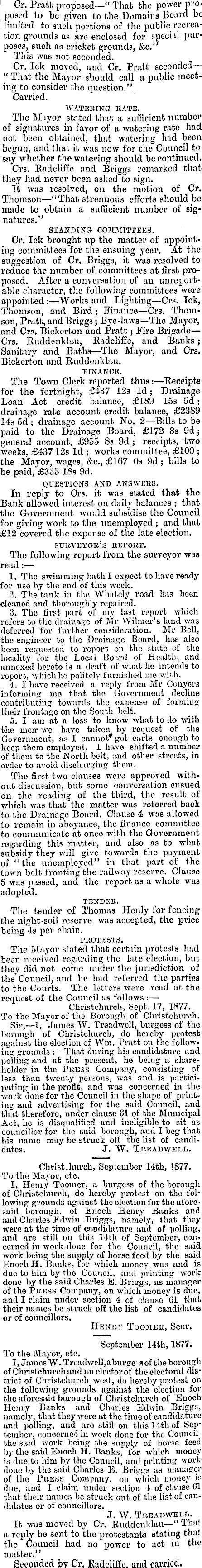 Cr. Pratt proposed—" That the power proposed to be given to the Domains Board be limited to such portions of the public recreation grounds as are enclosed for special purpose?, such as cricket grounds, &c." This was not seconded. Cr. Ick moved, and Cr. Pratt seconded — " That the Mayor should call a public meeting to consider the question." Carried. WATERING RATE. The Mayor stated that a sufficient number of signatures in favor of a watering rate had not been obtained, that watering had been begun, and that it was now for the Council to say whether the watering should be continued. Crs. Radcliffe and Briggs remarked that they had never been asked to sign. It was resolved, on the motion of Cr. Thomson —" That strenuous efforts should be made to obtain a sufficient number of signatures." STANDING COMMITTEES. Cr. Ick brought up the matter of appointing committees for the ensuing year. At the suggestion of Cr. Briggs, it was resolved to reduce the number of committees at first proposed. After a conversation of an unreportable character, the following committees were appointed : —Works and Lighting—Crs. Ick, Thomson, and Bird ; Finance—Crs. Thomson, Pratt, and Briggs; Bye-laws—The Mayor, and Crs. Bickerton and Pratt; Fire Brigade— Crs. Ruddenklau, Radcliffe, and Banks ; Sanitary and Baths—The Mayor, and Crs. Bickerton and Ruddenklau. FINANCE. The Town Clerk reported thus: —Receipts for the fortnight, £437 12s Id; Drainage Loan Act credit balance, £lB9 15s sd; drainage rate account credit balance, £2359 14s 5d ; drainage account No. 2—Bills to be paid to the Drainage Board, £172 3s 9d; general account, £955 8s 9d ; receipts, two weeks, £437 12s Id ; works committee, £IOO ; the Mayor, wages, &c, £167 0s 9d ; bills to be paid, £355 18s 9d. QUESTIONS AND ANSWERS. In reply to Crs. it was stated that the Bank allowed interest on daily balances ; that the G-overnment would subsidise the Council for giving work to the unemployed ; and that £l2 covered the expense of the late election. surveyor's report. The following report from the surveyor was read : 1. The swimming hath I expect to have ready for use by the end of this week. 2. The'tank in the Whately road has been cleaned and thoroughly repaired. 3. The first part of my last report which refers to the drainage of Mr Wilmer's land was deferred for further consideration. Mr Bell, the engineer to the Drainage Board, lias also been requested to report on the state of the locality for the Local Board of Health, and annexed hereto is a draft of what he intends to report, which he politely furnished mo with. 4. I have received a reply from Mr Conyers informing me that the Government decline contributing towards the expense of forming their frontage on the South belt. 5. I am at a loss to know what to do with the men' we have taken by request of the Government, as I cannot* get carts enough to keep them employed. 1 have shifted a. number of them to the North belt, and other streets, in order to avoid discharging them. The first two clauses were approved without discussion, but some conversation ensued on the reading of the third, the result of which was that the matter was referred back to the Drainage Board. Clause 4 was allowed to remain in abeyance, the finance committee to communicate at once with the G-overnment regarding this matter, and also as to what subsidy they will give towards the payment of "the unemployed" in that part of the town bolt fronting the railway reserve. Clause 5 was passed, and the report as a whole was adopted. TENDER. The tender of Thomas Hcnly for fencing the night-soil reserve was accepted, the price being 4s per chain. PROTESTS. Tiie Mayor stated that certain protests had been received regarding the late election, but they did not come under the jurisdiction of the Council, and he had referred the parties to the Courts. The letters were read at the request of the Council as follows : Christchurch, Sept. 17, 1877. To the Mayor of the Borough of Christchurch. Sir, —I, James W. Treadwell, burgess of the borough of Christchurch, do hereby protest against the election of Wm. Pratt on the following grounds : —That during his candidature and polling and at the present, he being a shareholder in the Press Company, consisting of less than twenty persons, was and is participating in the profit, and was concerned in the work done for the Council in the shape of printing and advertising for the said Council, and that therefore, under clause 01 of the Municipal Act, he is disqualified and ineligible to sit as councillor for the said borough, and I beg that his name may be struck oft' the list of candidates. J. W. Treadwell. Christ.hurch, September 14th, 1877. To the Mayor, etc. I, Henry Toomer, a burgess of the borough of Christchurch, do hereby protest on the following grounds against the election for the aforesaid borough, of Enoch Henry Banks and and Charles Edwin Briggs, namely, that they were at the time of candidature and of polling, and are still on this 14th of September, concerned in work done for the Council, the said work being the supply of horse feed by the said Enoch H. Banks, for which money was and is due to him by the Council, and printing work done by the said Charles E. Briggs, as manager of the Press Company, on which money is due, and I claim under section 4 of clause 61 that their names be struck off the list of candidates or of councillors. Henry Toomer, Seur. September 14th, 1877. To the Mayor, etc. I, James W. Treadwell,aburge sof the borough of Christchurch and an elector of the electoral district of Christchurch west, do hereby protest on the following grounds against the election for the aforesaid borough of Christchurch of Enoch Henry Banks and Charles Edwin Briggs, namely, that they were at the time of candidature and polling, and are still on this 14th of September, concerned in work done for the Councilthe said work being the supply of horse feed by the said Enoch H. B