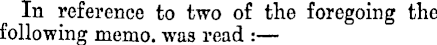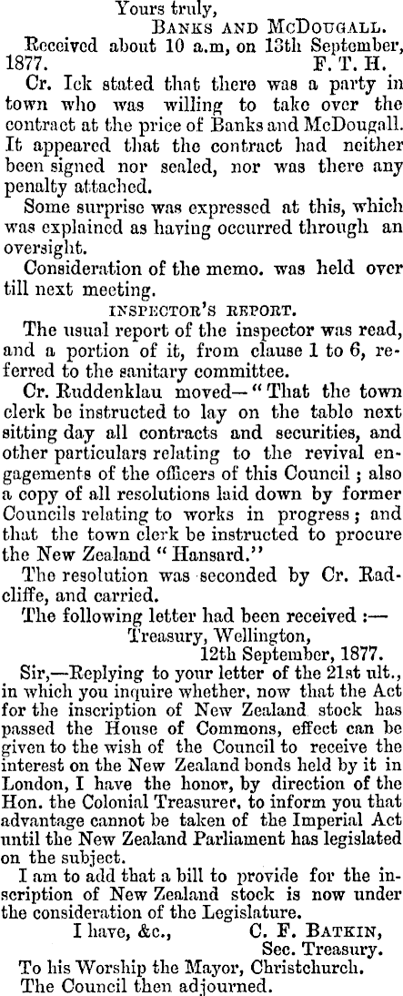 Yours truly, Banks and McDougall. Received about 10 a.m, on 13th September, 1877. F. T. H. Cr. Ick stated that there was a party in town who was willing to take over the contract at the price of Banks and McDougall. It appeared that the contract had neither been signed nor sealed, nor was there any penalty attached. Some surprise was expressed at this, which was explained as having occurred through an oversight. Consideration of the memo, was held over till next meeting. inspector's report. The usual report of the inspector was read, and a portion of it, from clause 1 to 6, referred to the sanitary committee. Cr. Ruddenklau moved— " That the town clerk be instructed to lay on the table next sitting day all contracts and securities, and other particulars relating to the revival engagements of the officers of this Council; also a copy of all resolutions laid down by former Councils relating to works in progress; and that the town clerk be instructed to procure the New Zealand " Hansard." The resolution was seconded by Cr. Radcliffe, and carried. The following letter had been received : Treasury, Wellington, 12th September, 1877. Sir, —Replying to your letter of the 21st ult., in which you inquire whether, now that the Act for the inscription of New Zealand stock has passed the House of Commons, effect can be given to the wish of the Council to receive the interest on the New Zealand bonds held by it in London, I have the honor, by direction of the Hon. the Colonial Treasurer, to inform you that advantage cannot be taken of the Imperial Act until the New Zealand Parliament has legislated on the subject. I am to add that a bill to provide for the inscription of New Zealand stock is now under the consideration of the Legislature. I have, &c, C. F. Batkin, Sec. Treasury. To his Worship the Mayor, Christchurch. The Council then adjourned.