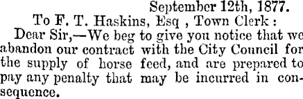 September 12th, 1877. To F. T. Haskins, Esq , Town Clerk : Dear Sir, —We beg to give you notice that we abandon our contract with the City Council for the supply of horse feed, and are prepared to pay any penalty that may be incurred in consequence.