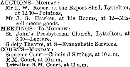 auctions-Monday : Mr E. W. Roper, at the Export Shed, Lyttelton, at 12.30 Potatoes, Mr J. G. Hawkes, at his Rooms, at 12—Miscellaneous goods. MEETINGS—To-Morkow : St. John's Presbyterian Chnrcli, Lyttelton, at 0.30 —Lecture. Gaiety Theatre, at B—Evangelistic Services. COURTS—Monday : Supreme Court—Criminal Sittings, at 10 a.m. R.M. Court, at 10 a.m. Ly+tfilton R.M. Court, at 11 a.m.
