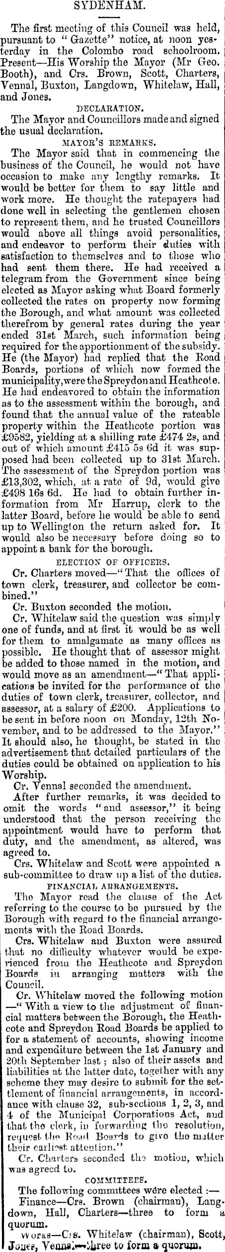 SYDENHAM. The first meeting of: this Council was held, pursuant to " Gazette" notice, at noon yesterday in the Colombo road schoolroom. Present—His Worship the Mayor (Mr Geo. Booth), and Crs. Brown, Scott, Charters, Vennal, Buxton, Langdown, Whitelaw, Hall, and Jones. DECLARATION. The Mayor and Councillors made and signed the usual declaration. mayor's remarks. The Mayor said that in commencing the business of the Council, he would not have occasion to make any lengthy remarks. It would be better for them to say little and work more. He thought the ratepayers had done well in selecting the gentlemen chosen to represent them, and he trusted Councillors would above all things avoid personalities, and endeavor to perform their duties with satisfaction to themselves and to those who had sent them there. He had received a telegram from the Government since being elected as Mayor asking what Board formerly collected the rates on property now forming the Borough, and what amount was collected therefrom by general rates during the year ended 31st March, such information being required for the apportionment of the subsidy. He (the Mayor) had replied that the Eoad Boards, portions of which now formed the I municipality,were the Spreydon and Heathcote. I He had endeavored to obtain the information I as to the assessment within the borough, and found that the annual value of the rateable property within the Heathcote portion was £9582, yielding at a shilling rate £474 2s, and out of which amount £415 5s 6d it was supposed had been collected up to 31st March. The assessment of the Spreydon portion was £13,302, which, at a rate of 9d, would give £498 16s 6d. He had to obtain further information from Mr Harrup, clerk to the latter Board, before he would be able to send up to Wellington the return asked for. It would also be necessary before doing so to appoint a bank for the borough. ELECTION OF OFFICERS. Cr. Charters moved—" That the offices of town clerk, treasurer, and collector be combined." Cr. Buxton seconded the motion. Cr. Whitelaw said the question was simply one of funds, and at first it would be as well for them to amalgamate as many oflices as possible. He thought that of assessor might be added to those named in the motion, and would move as an amendment—" That applications be invited for the performance of the duties of town clerk, treasurer, collector, and assessor, at a salary of £2OO. Applications to be sent in before noon on Monday, 12th No- j vember, and to be addressed to the Mayor." It should also, he thought, be stated in the advertisement that detailed particulars of the duties could be obtained on application to his Worship. Cr. Vennal seconded the amendment. After further remarks, it was decided to omit the words "and assessor," it being understood that the person receiving the appointment would have to perform that duty, and the amendment, as altered, was agreed to. Crs. Whitelaw and Scott were appointed a sub-committee to draw up a list of the duties. FINANCIAL arrangements. The Mayor read the clause of the Act referring to the course to bo pursued by the Borough with regard to the financial arrangements with the Road Boards. Crs. Whitelaw and Buxton were assured that no difficulty whatever would be experienced from the Heathcote and Spreydon Boards in arranging matters with the Council. Cr. Whitelaw moved the following motion —" With a view to the adjustment of financial matters between the Borough, the Heathcote and Spreydon Road Boards be applied to for a statement of accounts, showing income and expenditure between the Ist January and 20th September last; also of their assets and liabilities at the latter date, together witli any scheme they may desire to submit for the settlement of financial arrangements, in accordance with clause 32, sub-sections 1,2, 3, and 4 of the Municipal Corporations Act, and that the clerk, in forwarding the resolution, request the Road Bourds to givo tho nutter their earliest attention." Cr. Charters seconded th:> motion, which ■was agreed to. COMMITTEES. The following committees were elected : Finance —Crs. Brown (chairman), Langdown, Hall, Charters—three to form a quorum. vvoms—C'.'S. Whitelaw (chairman), Scott, Jew*, to form a quorum.