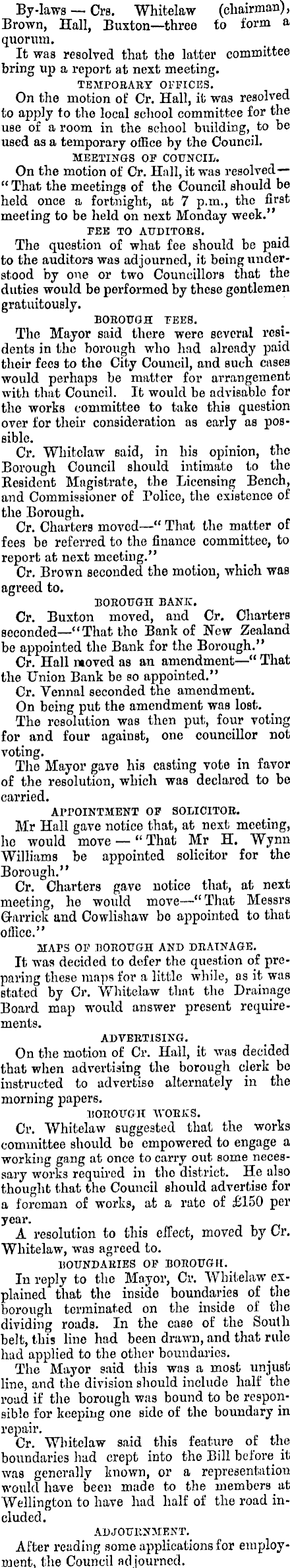 By-laws Crs. Whitelaw (chairman), Brown, Hall, Buxton—three to form a quorum. It was resolved that the latter committee bring up a report at next meeting. temporary offices. On the motion of Or. Hall, it was resolved to apply to the local school committee for the use of a room in the school building, to be used as a temporary office by the Council. MEETINGS OP COUNCIL. On the motion of Cr. Hall, it was resolved — " That the meetings of the Council should be held once a fortnight, at 7 p.m., the first meeting to be held on next Monday week." PEE TO AUDITORS. The question of what fee should be paid to the auditors was adjourned, it being understood by one or two Councillors that the duties would be performed by these gentlemen gratuitously. BOROUGH TEES. The Mayor said there were several residents in the borough who had already paid their fees to the City Council, and such cases would perhaps be matter for arrangement with that Council. It would be advisable for the works committee to take this question over for their consideration as early as possible. Cr. Whitelaw said, in his opinion, the Borough Council should intimate to the Resident Magistrate, the Licensing Bench, and Commissioner of Police, the existence of the Borough. Cr. Charters moved —" That the matter of fees be referred to the finance committee, to report at next meeting." Cr. Brown seconded the motion, which was agi - eed to. BOROUGH BANK. Cr. Buxton moved, and Cr. Charters seconded—" That the Bank of New Zealand be appointed the Bank for the Borough." Cr. Hall moved as an amendment —" That the Union Bank be so appointed." Cr. Vennal seconded the amendment. On being put the amendment was lost. The resolution was then put;, four voting for and four against, one councillor not voting. The Mayor gave his casting vote in favor of the resolution, which was declared to be carried. APPOINTMENT OP SOLICITOR. Mr Hall gave notice that, at next meeting, he would move Williams be appointed solicitor for the Borough." Cr. Charters gave notice that, at next meeting, he would move —"That Messrs Garrick and Cowlishaw be appointed to that office." MATS OF BOROUGH AND DRAINAGE. It was decided to defer the question of preparing these maps for a little while, as it was stated by Cr. Whitelaw that the Drainage Board map would answer present requirements. ADVERTISING. On the motion of Cr. Hall, it was decided that when advertising the borough clerk be instructed to advertise alternately in the morning rjapers. BOROUGH WORKS. Cr. Whitelaw suggested that the works committee should be empowered to engage a working gang at once to carry out some necessary works required in the district. He also thought that the Council should advertise for a foreman of works, at a rate of £l5O per year. A resolution to this effect, moved by Cr. Whitelaw, was agreed to. BOUNDARIES OF BOROUGH. In reply to the Mayor, Cr. Whitelaw explained that the inside boundaries of the borough terminated on the inside of the dividing roads. In the case of the South belt, this line had been drawn, and that rule hud applied to the other boundaries. The Mayor said this was a most unjust line, and the division should include half the road if the borough was bound to be responsible for keeping one side of the boundary in repair. Cr. Whitelaw said this feature of the boundaries had crept into the Bill before it was generally known, or a representation would have been made to the members at Wellington to have had half of the road included. ADJOURNMENT. After reading some applications for employment, the Council adjourned.