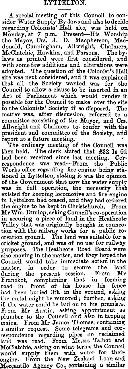 LYTTELTON. A special meeting of this Council to consider Water Supply By-laws and also to decide regarding Colonists’ Hall site, was held on Monday, at 7 p.m. Present—His Worship the Mayor, Crs. J. D. Macpherson, Macdonald, Cunningham, Allwright, Chalmers, McClatchie, Hawkins, and Parsons. The bylaws as printed were first considered, and with some few additions and alterations were adopted. The question of the Colonist’s Hall site was next considered, and it was explained that all the Society wanted was for the Council to allow a clause to be inserted in an Act of Parliament which would render it possible for the Council to make oyer the site to the Colonists’ Society if so disposed. The matter was, after discussion, referred to a committee consisting of the Mayor, and Crs. Allwright and Chalmers to confer with the president and committee of the Society, aild report at a future meeting. The ordinary meeting of the Council was then held. The clerk stated that £32 Is 6d had been received since last meeting. Correspondence was read—Prom the Public Works office regarding fire engine being stationed in Lyttelton, stating it was the opinion of the Q-overnment that now the water supply was in full operation, the necessity that existed for keeping locomotive and fire engine in Lyttelton had ceased, and they had ordered the engine to be kept in Christchurch. Prom Mr Wm. Dunlop, asking Council’s co-operation in securing a piece of land in the Heathcote Yalley that was originally bought in connection with the railway works for a public recreation ground. The land was suitable for a cricket ground, and was of no use for railway purposes. The Heathcote Road Board were also moving in the matter, and they hoped the Council would take immediate action in the matter, in order to secure the land during the present session. From Mr Franckot, complaining that in forming road in front of his house his fence had been buried 3ft. in the ground, asking the metal might be removed; further, asking if (ho water could be laid on to his premises. From Mr Austin, asking appointment as plumber to the Council and also in tapping mains. Prom Mr James Thomas, containing a similar request. Some telegrams and correspondence regarding pipes on reclaimed land was read. Prom Messrs Talbot and McClatchie, asking on what terms the Council would supply them with water for their engine. Prom the New Zealand Loan and Mercantile Agency Co., containing a similar