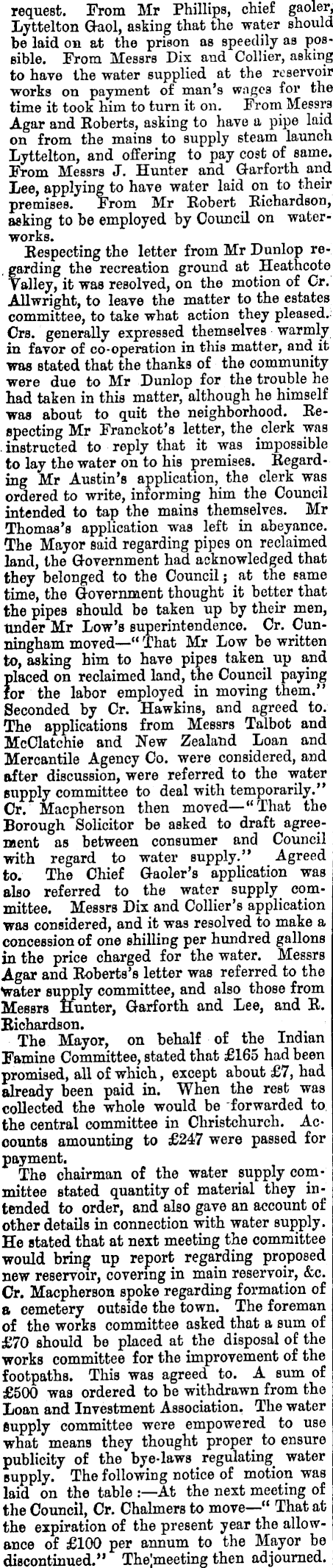 request. From Mr Phillips, chief gaoler, Lyttelton Gaol, asking that the water should be laid on at the prison as speedily as possible. From Messrs Dix and Collier, asking to have the water supplied at the reservoir works on payment of man’s wages for the time it took him to turn it on. From Messrs Agar and Roberts, asking to have a pipe laid on from the mains to supply steam launch Lyttelton, and offering to pay cost of same. From Messrs J. Hunter and Garforth and Lee, applying to have water laid on to their premises. From Mr Robert Richardson, asking to be employed by Council on waterworks. Respecting the letter from Mr Dunlop regarding the recreation ground at Heathcote Valley, it was resolved, on the motion of Cr. Allwright, to leave the matter to the estates committee, to take what action they pleased. Crs. generally expressed themselves warmly in favor of co-operation in this matter, and it was stated that the thanks of the community were due to Mr Dunlop for the trouble he had taken in this matter, although he himself was about to quit the neighborhood. Respecting Mr Franckot’s letter, the clerk was instructed to reply that it was impossible to lay the water on to his premises. Regarding Mr Austin’s application, the clerk was ordered to write, informing him the Council intended to tap the mains themselves. Mr Thomas’s application was left in abeyance. The Mayor said regarding pipes on reclaimed land, the Government had acknowledged that they belonged to the Council; at the same time, the Government thought it better that the pipes should be taken up by their men, under Mr Low’s superintendence. Cr. Cunningham moved —“ That Mr Low be written to, asking him to have pipes taken up and placed on reclaimed land, the Council paying for the labor employed in moving them.” Seconded by Cr. Hawkins, and agreed to. The applications from Messrs Talbot and McOlatchie and New Zealand Loan and Mercantile Agency Co. were considered, and after discussion, were referred to the water supply committee to deal with temporarily.” Cr. Macpherson then moved —“That the Borough Solicitor be asked to draft agreement as between consumer and Council with regard to water supply.” Agreed to. The Chief Gaoler’s application was also referred to the water supply committee. Messrs Dix and Collier’s application was considered, and it was resolved to make a concession of one shilling per hundred gallons in the price charged for the water. Messrs Agar and Roberts’s letter was referred to the Water supply committee, and also those from Messrs Hunter, Garforth and Lee, and R. Richardson. The Mayor, on behalf of the Indian Famine Committee, stated that £165 had been promised, all of which, except about £7, had already been paid in. When the rest was collected the whole would be forwarded to the central committee in Christchurch. Accounts amounting to £247 were passed for payment. The chairman of the water supply committee stated quantity of material they intended to order, and also gave an account of other details in connection with water supply. He stated that at next meeting the committee would bring up report regarding proposed new reservoir, covering in main reservoir, &c. Cr. Macpherson spoke regarding formation of a cemetery outside the town. The foreman of the works committee asked that a sum of £7O should be placed at the disposal of the works committee for the improvement of the footpaths. This was agreed to. A sum of £SOO was ordered to be withdrawn from the Loan and Investment Association. The water Supply committee were empowered to use what means they thought proper to ensure publicity of the bye-laws water supply. The following notice of motion was laid on the table At the next meeting of the Council, Cr. Chalmers to move —“ That at the expiration of the present year the allowance of £IOO per annum to the Mayor be discontinued.” Thejmeeting then adjourned.