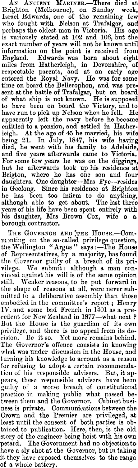 An Ancient Mabinbr.—There died at Brighton (Melbourne), on Sunday week, Israel Edwards, one of the remaining few who fought with Nelson at Trafalgar, and perhaps the oldest man in Victoria. His age is variously stated at 102 and 106, but the exact number of years will not be known until information on the point is received from England. Edwards was born about eight miles from Hatherleigh, in Devonshire, of respectable parents, and at an early age entered the Eoyal Navy. He was for some time on board the Bellerophon, and was present at the battle of Trafalgar, but on board of what ship is not known. He is supposed to have been on board the Victory, and to have run to pick up Nelson when he fell. He apparently left the navy before he became entitled to a pension, and settled in Hatherleigh. At the age of 45 he married, his wife being 21. In July, 1847, his wife having died, he went with his family to Adelaide, and five years afterwards came to Victoria. For some few years he was on the diggings, but he afterwai'ds took up his residence at Brigton, where he has one son and four daughters. One daughter—Mrs Pye—resides in Geelong. Since his residence at Brighton he has been too infirm to do anything, although able to get about. The last three years of his life have been spent entirely with his daughter, Mrs Brown Cox, wife o a borough contractor. The Governor and 'the House.—Commenting on the so-called privilege question, the Wellington "Argus" says: —The House of Representatives, by a majority, has found the Governor guilty of a breach of its privilege. We submit: although a man convinced against his will is of the same opinion still. Weaker reasons, to be put forward in the shape of reasons at all, were never submitted 1 o a deliberative assembly than those embodied in the committee's report; Henry IV. and some bad French in 1401 as a precedent for New Zealand in 1877 —what next ? But the House is the guardian of its own privilege, and there is no appeal from its decision. Be it so. Yet more remains behind. The Governor's offence consists in knowing what was under discussion in the House, and turning his knowledge to account as a reason for refusing to adopt a certain recommendation of his responsible advisers. But, it appears, these responsible advisers have been guilty of a worse breach of constitutional practice in making public what passed between them and the Governor. Cabiuet business is private. Communications between the Crown and the Premier are privileged, at least until the consent of both parties is obtained to publication. Here, then, is the old story of the engineer being hoist with his own petard. The Government had no objection tohave a sly shot at the Governor, but in taking it they have exposed themselves to the range of a whole battery.