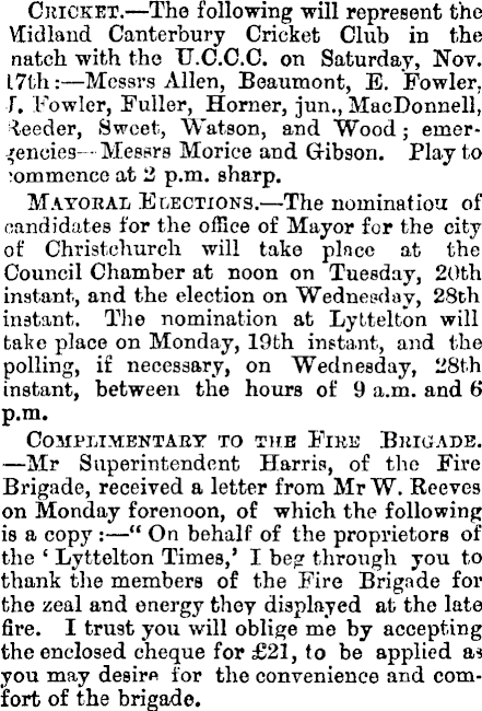 Cricket. —The following will represent the Vtidland Canterbury Cricket Club in the natch with the U.C.C.C. on Saturday, Nov. 17th: —Messrs Allen, Beaumont, E. Fowler. T. Fowler, Fuller, Horner, jun., Mac Donnell, ieeder, Sweet, W'atson, and Wood; emergencies Messrs Morice and Gibson. Play to "ommenco at 2 p.m. sharp. Mayoral Elections.—The nominatiou of candidates for the office of Mayor for the city of Christchurch will take place at the Council Chamber at noon on Tuesday, 20th instant, and the election on Wednesday, 28th instant. The nomination at Lyttelton will take place on Monday, 19th instant, and the polling, if necessary, on Wednesday, 28th instant, between the hours of 9 a.m. and 6 p.m. Complimentary to tub Fire Brigade. —Mr Superintendent Harris, of the Fire Brigade, received a letter from Mr W. Reeves on Monday forenoon, of which the following is a copy : —" On behalf of the proprietors of the ' Lyttelton Times,' I beg through you to thank the members of the Fire Brigade for the zeal and energy they displayed at the late fire. I trust you will oblige me by accepting the enclosed cheque for £2l, to be applied a? you may desire for the convenience and comfort of the brigade.