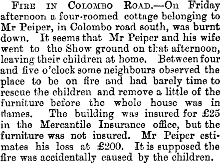 Fire in Colombo Road.—On Friday afternoon a four-roomed cottage belonging to Mr Peiper, in Colombo road south, was burnt down. It seems that Mr Peiper and his wife went to the Show ground on that afternoon, loaving their children at home. Between four and five o'clock some neighbours observed the place to be on fire and had barely time to rescue the children and remove a little of the furniture before the whole house was in dames. The building was insured for £25 in the Mercantile Insurance office, but the furniture was not insured. Mr Peiper estimates his loss at £2OO. It is supposed the fire was accidentally caused by the children.