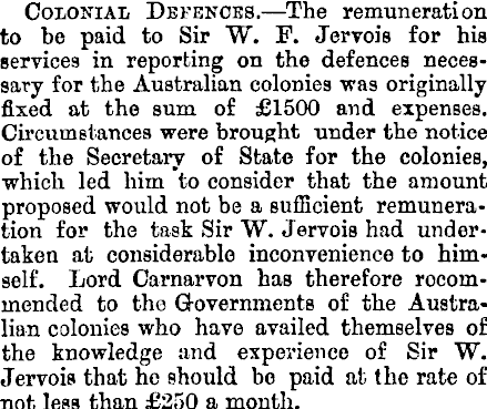 Colonial Defences.—The remuneration to be paid to Sir W. P. Jervois for his services in reporting on the defences necessary for the Australian colonies was originally fixed at the sum of £ISOO and expenses. Circumstances were brought under the notice of the Secretary of State for the colonies, which led him to consider that the amount proposed would not be a sufficient remuneration for the task Sir W. Jervois had undertaken at considerable inconvenience to himself. Lord Carnarvon has therefore rocommended to tho Governments of the Australian colonies who have availed themselves of the knowledge and experience of Sir W. Jervois that he should bo paid at the rate of not less than £250 a month.