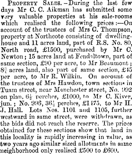 Property Sales. -During the last few days Mr C. C. Aikman has submitted some Tdry valuable properties at his sale-rooms which realised the following prices:—On account of the trustees of Mrs C. Thompson, property at Northcote consisting of dwellinghouse and 11 acres laud, part of R.S. No. 80, North road, £ISOO, purchased by Mr C. Newton; 15 acres land at Fendnltown, part of same section, £9O per acre, to Mr Beaumont; 8i acres land, also part of same section, £45 per acre, to Mr R. Wilkin. On account of the trustees of Mrs Hawdon, town sections in Tuam street, near Manchester street, No. I*o2 on plan. 6£ perches, £IOOO, to Mr C. Kivcr, jun. ; No."!)!tS, 36.' perches, £1175, to Mr H. J. Hall. Lots Nos. 1101 and 1105, further westward in same street, were withdrawn, as the bids did not reach the reserve. The prices obtained for these sections show that land in this locality is rapidly increasing in value, as two years ago similar sized allotments in same neighborhood only realised £SOO to £6OO.