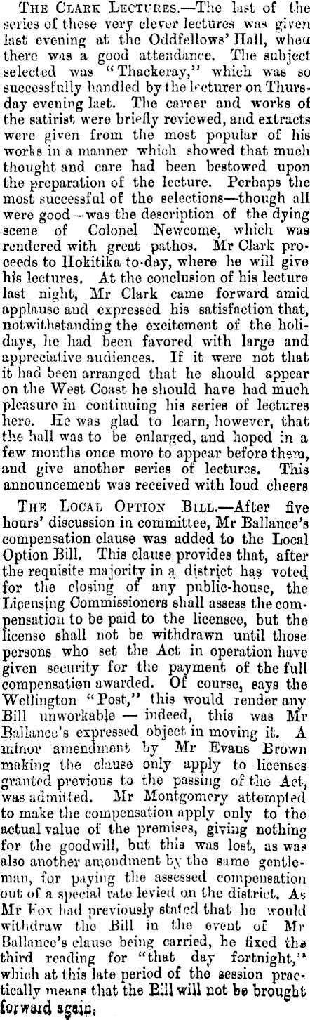 The Clark Lectures.—The last of the series of these very clever lectures was given last evening at the Oddfellows' Hall, wheu there was a good attendance. The subject selected was "Thackeray," which was so successfully handled by the lecturer on Thursday evening last. The career and works of the satirist were briefly reviewed, and extracts were given from the most popular of his works in a manner which showed that much thought and care had been bestowed upon the preparation of the lecture. Perhaps the most successful of the selections—though all were good - was the description of the dying scene of Colonel Newcome, which was rendered with great pathos. Mr Clark proceeds to Hokitika to-day, where he will give his lectures. At the conclusion of his lecture last night, Mr Clark came forward amid applause and expressed his satisfaction that, notwithstanding the excitement of the holidays, he had been favored with large and appreciative audiences. If it were not that it had been arranged that he should appear on the West Coast he should have had much pleasure in continuing his series of lectures hero. Ke was glad to learn, however, that the hall was to be enlarged, and hoped in a few months once more to appear beforo them, and give another series of lectures. This announcement was received with loud cheers The Local Option Bill.—After five hours' discussion in committee, Mr Ballance's compensation clause was added to the Local Option Bill. This clause provides that, after the requisite majority in a district has voted for the closing of any public-house, the Licensing Commissioners shall assess the compensation to be paid to the licensee, but the license shall not be withdrawn until those persons who set the Act in operation have given security for the payment of the full compensation awarded. Of course 3 gays the Wellington "Post," this would render any Bill unworkable indeed, this was Mr Ballance's expressed object in moving it. A minor amendment by Mr Evans Brown making the clause only apply to licenses granted previous to the passing of the Act, was admitted. Mr Montgomery attempted to make the compensation apply only to the actual value of the premises, giving nothing for the goodwill, but this was lost, as was also another amendment by tho same gentleman, for paying the assessed compensation out of a special rate levied on the district. As Mr Fox had previously stated that ho would withdraw the Bill in the event of Mr Ballance's clause being carried, he fixed thd third reading for "that day fortnight/ 1 which at this late period of the session practically means that the EUI will not be brought forward ftgftW,