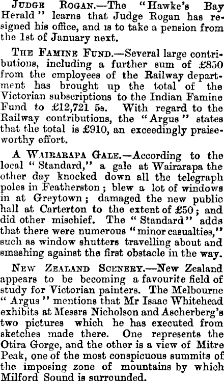 Judge Roqan.—The "Hawke's Bay Herald " learns that Judge Rogan has resigned his office, and is to take a pension from the Ist of January next. The Famine Fund.—Several large contributions, including a further sum of £BSO from the employees of the Railway department has brought up the total of the Victorian subscriptions to the Indian Famine Fund to £12,721 5&. With regard to the Railway contributions, the "Argus" states that the total is £9lO, an exceedingly praiseworthy effort. A Waieabapa Gale.—According to the local " Standard," a gale at Wairarapa the other day knocked down all the telegraph poles in Featherston ; blew a lot of windows in at Greytown ; damaged the now public hall at Carterton to the extent of £SO; and did other mischief. The "Standard" adds that there were numerous "minorcasualties," such as window shutters travelling about and smashing against the first obstacle in the way. New Zealand Scenery.—New Zealand appears to be becoming a favourite field of study for Yictorian painters. The Melbourne " Argus " mentions that Mr Isaac Whitehead exhibits at Messrs Nicholson and Ascherberg's two pictures which he has executed from sketches made there. One represents the Otira Gorge, and the other is a view of Mitre Peak, one of the most conspicuous summits of the imposing zone of mountains by which Milford Sound is surrounded.