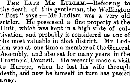 The Late Mb Ludlam.—Referring to the death of this gentleman, the Wellington " Post " says : —Mr Ludlam was a very old settler. He possessed a fine property at the Hutt, which was kept in a high state of cultivation, and probably is considered as one of the most valuable in that district. Mr Ludlam was at one time a member of the General Assembly, and also sat for many years in the Provincial Council. He recently made a visit to Europe, when he lost his wife through death, and now he himself in turn has passed away.