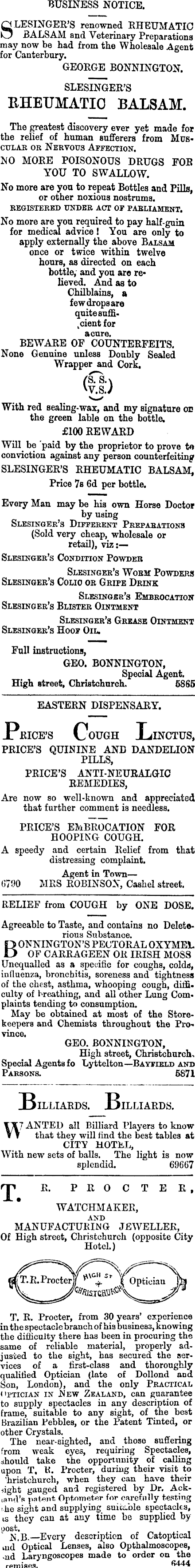 BUSINESS NOTICE. SLESINGER'S renowned RHEUMATIC BALSAM and Veterinary Preparations may now be had from the Wholesale Agent for Canterbury. GEORGE BONNINGTON. SLESINGER'S RHEUMATIC BALSAM. The greatest discovery ever yet made for the relief of human sufferers from Muscular or Nervous Affection. NO MORE POISONOUS DRUGS FOB YOU TO SWALLOW. No more are you to repeat Bottles and Pills, or other noxious nostrums. REGISTERED UNDER ACT OF PARLIAMENT. No more are you required to pay half-guin for medical advice! You are only to apply externally the above Balsam once or twice within twelve hours, as directed on each bottle, and you are re* lieved. And as to Chilblains, a few drops are quite sufficient for BEWARE OP COUNTERFEITS. None Genuine unless Doubly Sealed Wrapper and Cork. With red sealing-wax, and my signature od the green lable on the bottle. £IOO REWARD Will be paid by the proprietor to prove te conviction against any person counterfeiting SLESINGER'S RHEUMATIC BALSAM, Price 7s 6d per bottle. Every Man may be his own Horse Doctor by using Slesinger's Different Preparations (Sold very cheap, wholesale or retail), viz:— Slesinger's Condition Powder Slesinger's Worm Powders Slesinger's Colio or Gripe Drink Slesinger's Embrocation Slesinger's Blister Ointment Slesinger's Grease Ointment Slesinger's Hoof Oil. Full instructions, GEO. BONNINGTON, Special Agent. High street, Christchurch. 5885 EASTERN DISPENSARY. 3 C< RICE'S JUINCTUS, PRICE'S QUININE AND DANDELION PILLS, PRICE'S ANTI-NEURALGIC REMEDIES, Are now so well-known and appreciated that further comment is needless. PRICE'S EMBROCATION FOR HOOPING COUGH. A speedy and certain Relief from that distressing complaint. Agent in Town—--6790 MRS ROBINSON, Cashel street. RELIEF from COUGH by ONE DOSE. Agreeable to Taste, and contains no Deleterious Substance. BONNINGTON'S PECTORAL OXYMEL OF CARRAGEEN OR IRISH MOSS Unequalled as a specific for coughs, colds, influenza, bronchitis, soreness and tightness of the chest, asthma, whooping cough, difficulty of breathing, and all other Lung Complaints tending to consumption. May be obtained at most of the Storekeepers and Chemists throughout the Province. GEO. BONNINGTON, High street, Christchurch, Special Agents fo Lyttelton—Bayfield and Parsons. 5871 >ILLIARDS. MILLIARDS. 'J ANTED all Billiard Players to know w T that they will find the best tables at CITY HOTEL, With new sets of balls. The light is now splendid. 69667 ' R. PROCTER, WATCHMAKER, and MANUFACTURING JEWELLER, Of High street, Christchurch (opposite City Hotel.) T.R.Procter)/^'Yc Optician J) T. R. Procter, from 30 years' experience in the spectacle branch of his business, knowing the difficulty there has been in procuring the same of reliable material, properly adjusted to the sight, has secured the services of a first-class and thoroughly qualified Optician (late of Dollond and Son, London), and the only Practical optician in New Zealand, can guarantee to supply spectacles in any description of frame, suitable to any sight, of the best Brazilian Pebbles, or the Patent Tinted, or other Crystals. The near-sighted, and those suffering from weak eyes, requiring Spectacles, should take the opportunity of calling upon T, R. Procter, during their visit to 'hristchurch, when they can have their sight gauged and registered by Dr. Ackiand's patent Optometer for carefully testing ■he sight and supplying suitable spectacles, is they can at any time be supplied by 'JOSt. N.B.—Every description of Catoptical aid Optical Lenses, also Opthalmoscopes, nd Laryngoscopes made to order on the rnmiisa. 6444