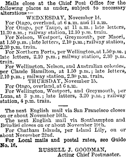 MaU3 close at the Chief Post Office for the following places as under, subject to necessary alterations : WEDNESDAY, November 14. For Otago, overland, at 6 a.m. and 11 a.m. For Otago, per Taupo, at 11 a.m.;. late letters, 11.20 a.m.; railway station, 12.10 p.m. train. For Nelson, Westport, Greynioufch, per Maori, at 1.50 p.m.; late loiters, 2.10 p.m.; railway station, 2.30 p.m. train. For Northern Ports, per Wellington, at 1.50p.m.; late letters, 2.10 p.m.; railway station, 2.30 p.m. train. For Wellington, Nelson, and Australian colonies, per Claude Hamilton, at 1.50 p.m.; late letters, 2.10 p.m.; railway station, 2.30 p.m. train. TH (JESDAY, November 15. For Otago, overland, at G a.m. For Wellington, Westport, and Greymoutli, per Luna, at 3 p.m.; late latters, 3.20 p.m.; railway station, 4 p.m. train. The next English mail via San Francisco closes on or about November 16th. The next English mail via Southampton and Brindisi closes on or about November 19th. For Chatham Islands, per Island Lily, on or about November 22nd. For Local mails and postal rates, Bee Guide No. 16. EUSSELL J. GOODMAN, Acting Chief Postmaster.